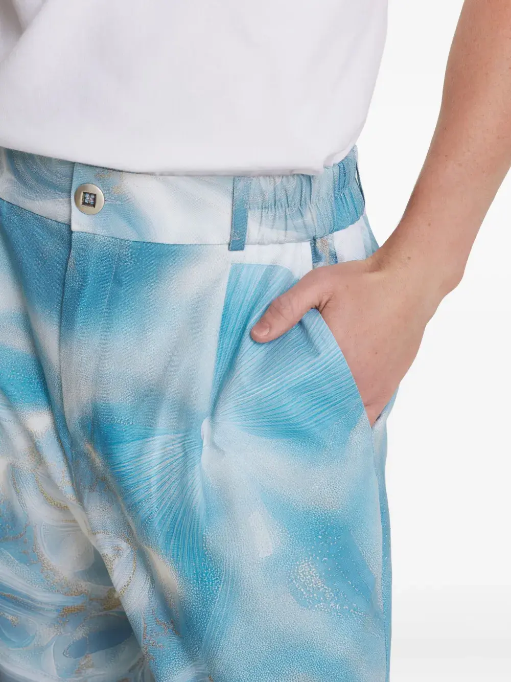 синий с принтом по всей поверхности, шлёвки для ремня, застёжка на пуговицу, боковые карманы в швах, задние карманы