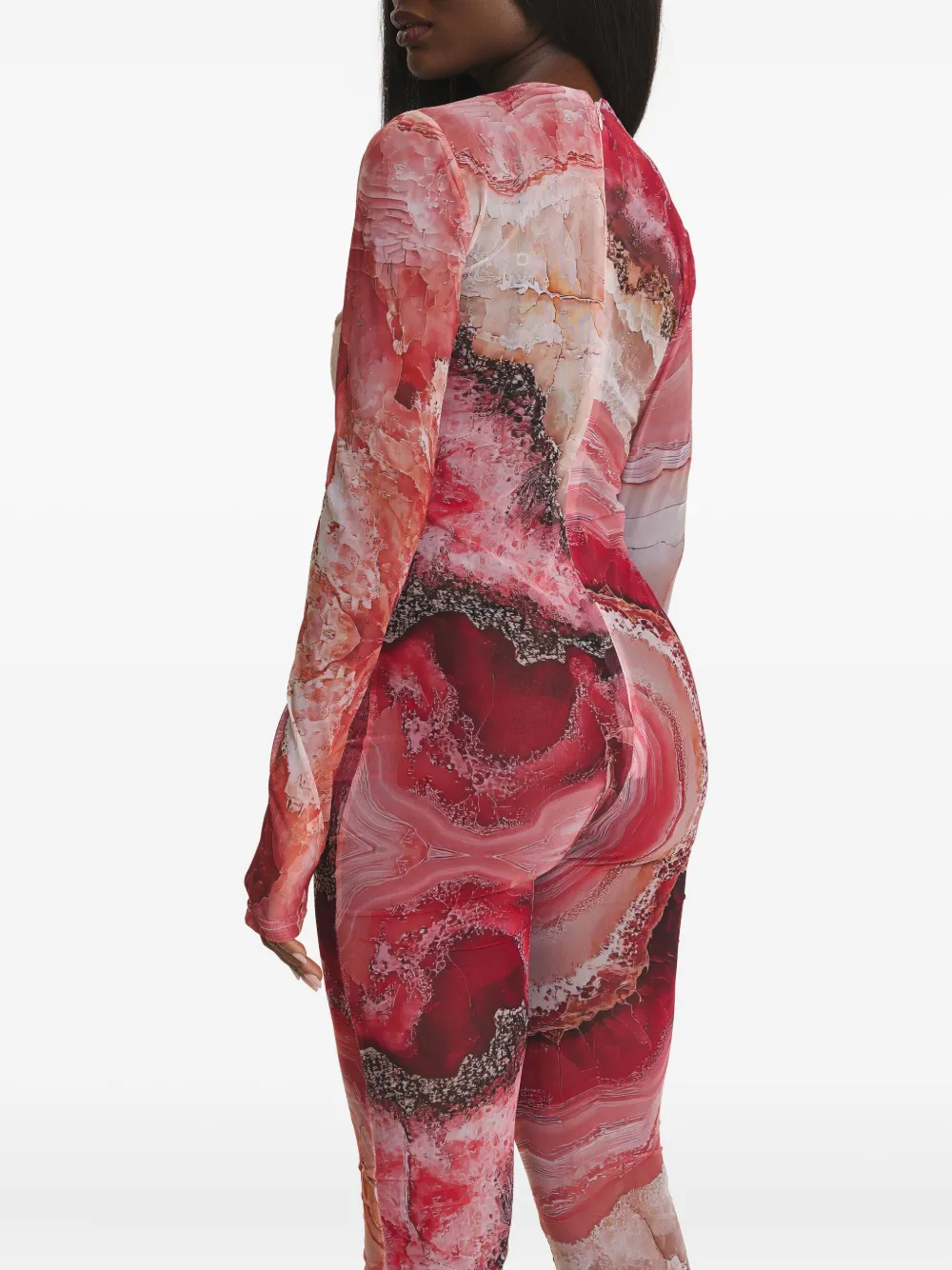 розовая сетчатая кофта с длинными рукавами, узором по всей поверхности, круглым вырезом и разрезами по краям
