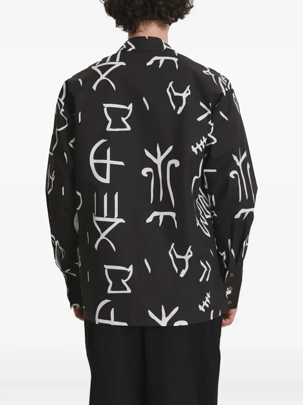 черный с графическим принтом, застежка на пуговицы, длинные рукава, манжеты на пуговицах, боковые разрезы