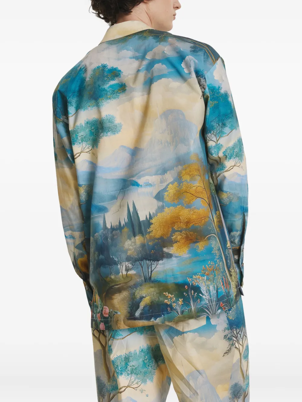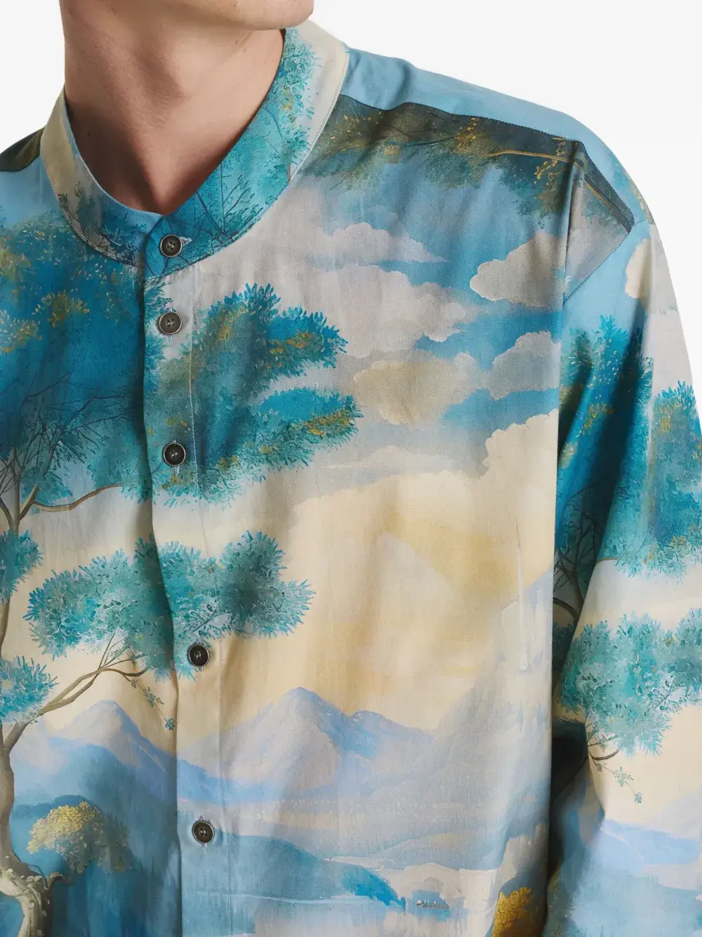 голубая туника с пейзажным принтом, воротником-стойкой, застежкой на пуговицы и длинными рукавами