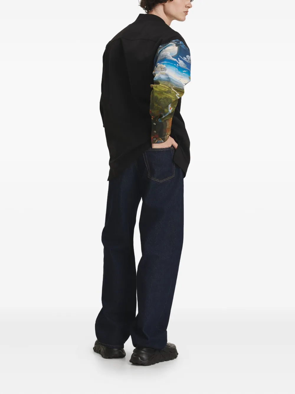черная рубашка с застежкой на пуговицы, воротником-стойкой, длинными рукавами, манжетами на пуговицах и принтом на рукаве