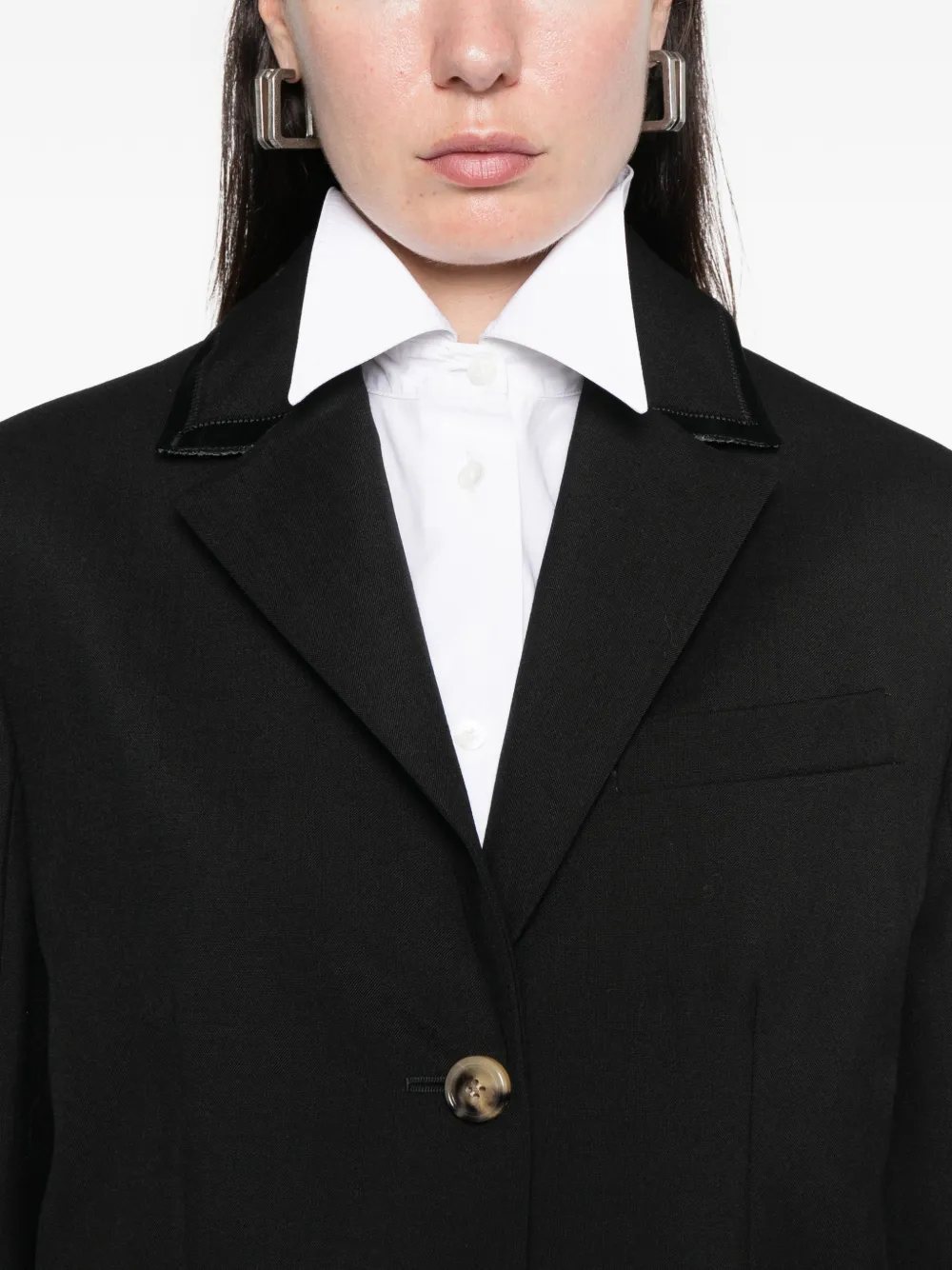 черная застежка на пуговицы спереди, нагрудный прорезной карман, два передних клапанных кармана, длинные рукава