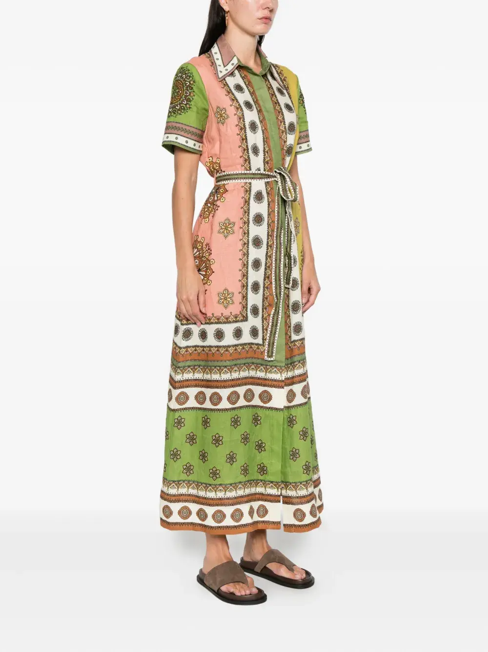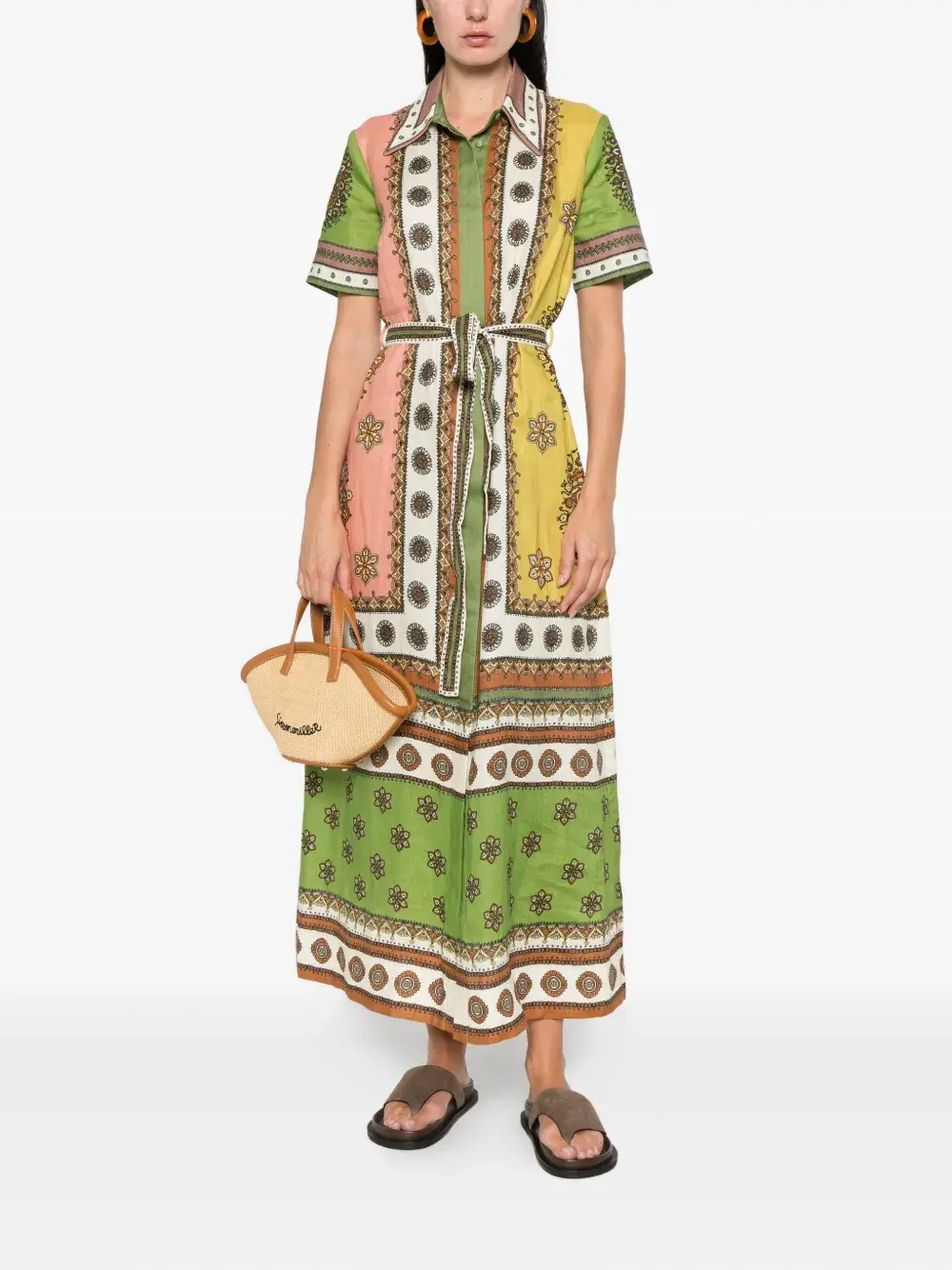 зелёный и разноцветный, воротник с острыми концами, короткие рукава, застёжка на пуговицы спереди, в комплекте пояс для завязывания