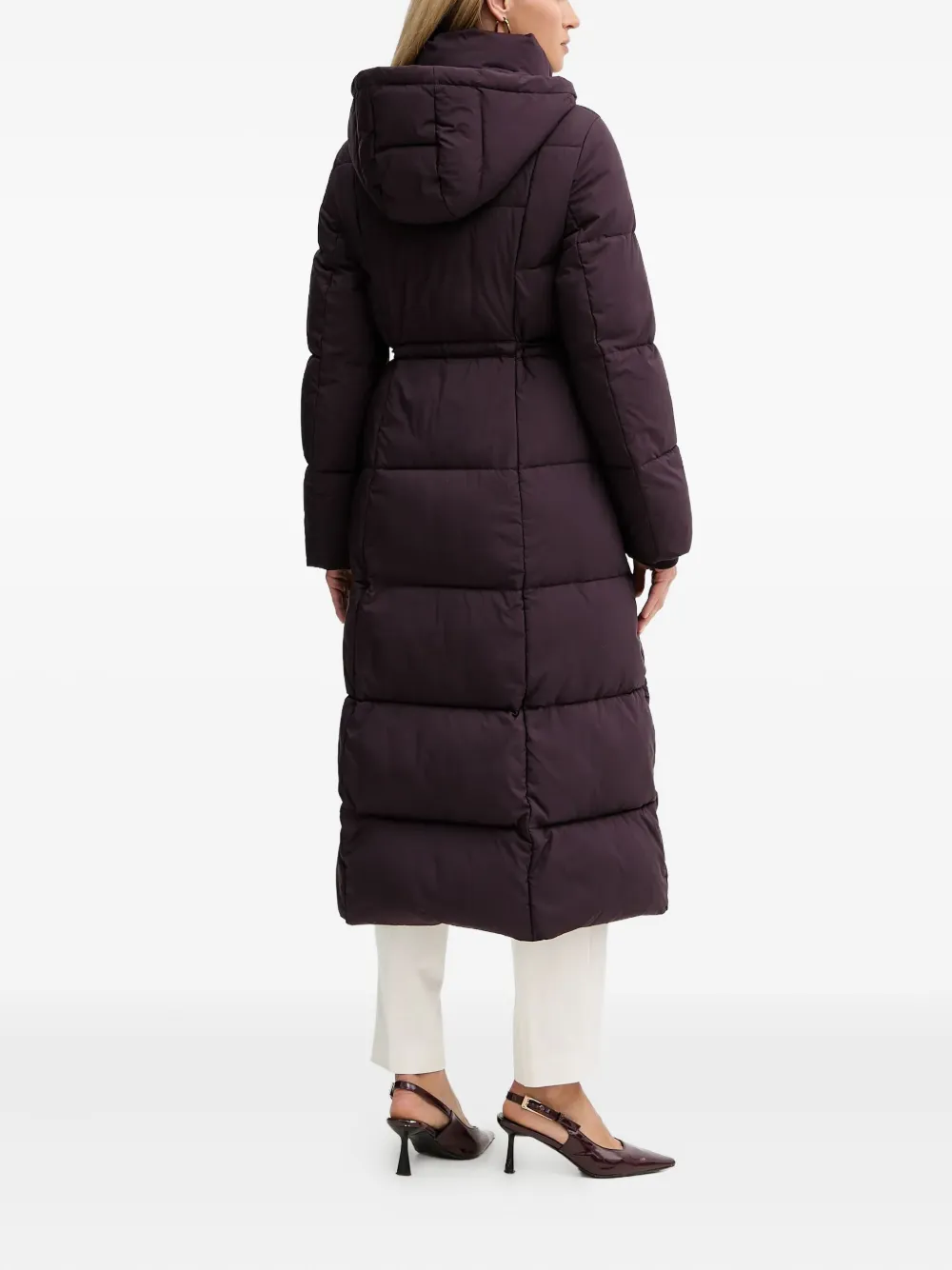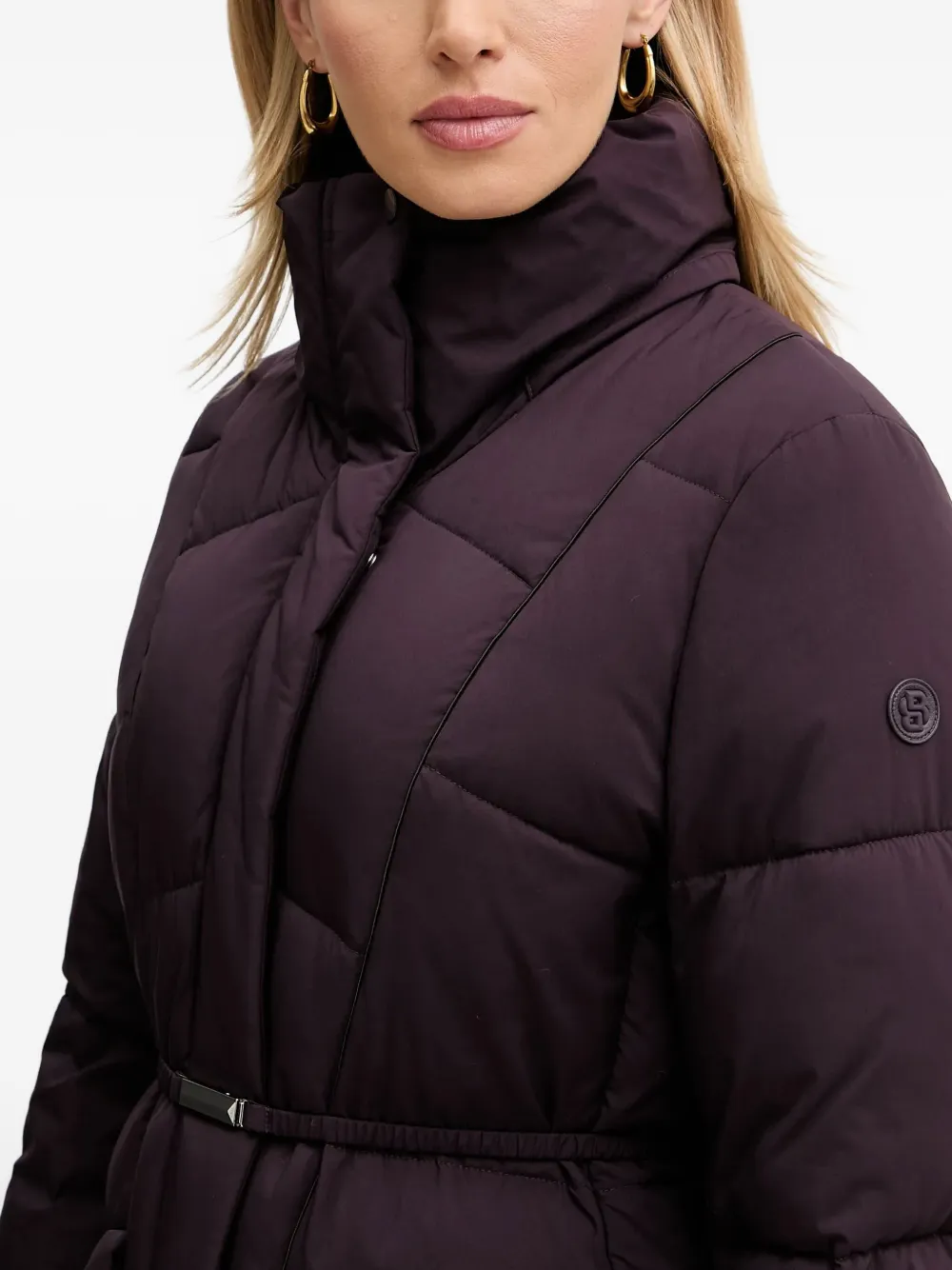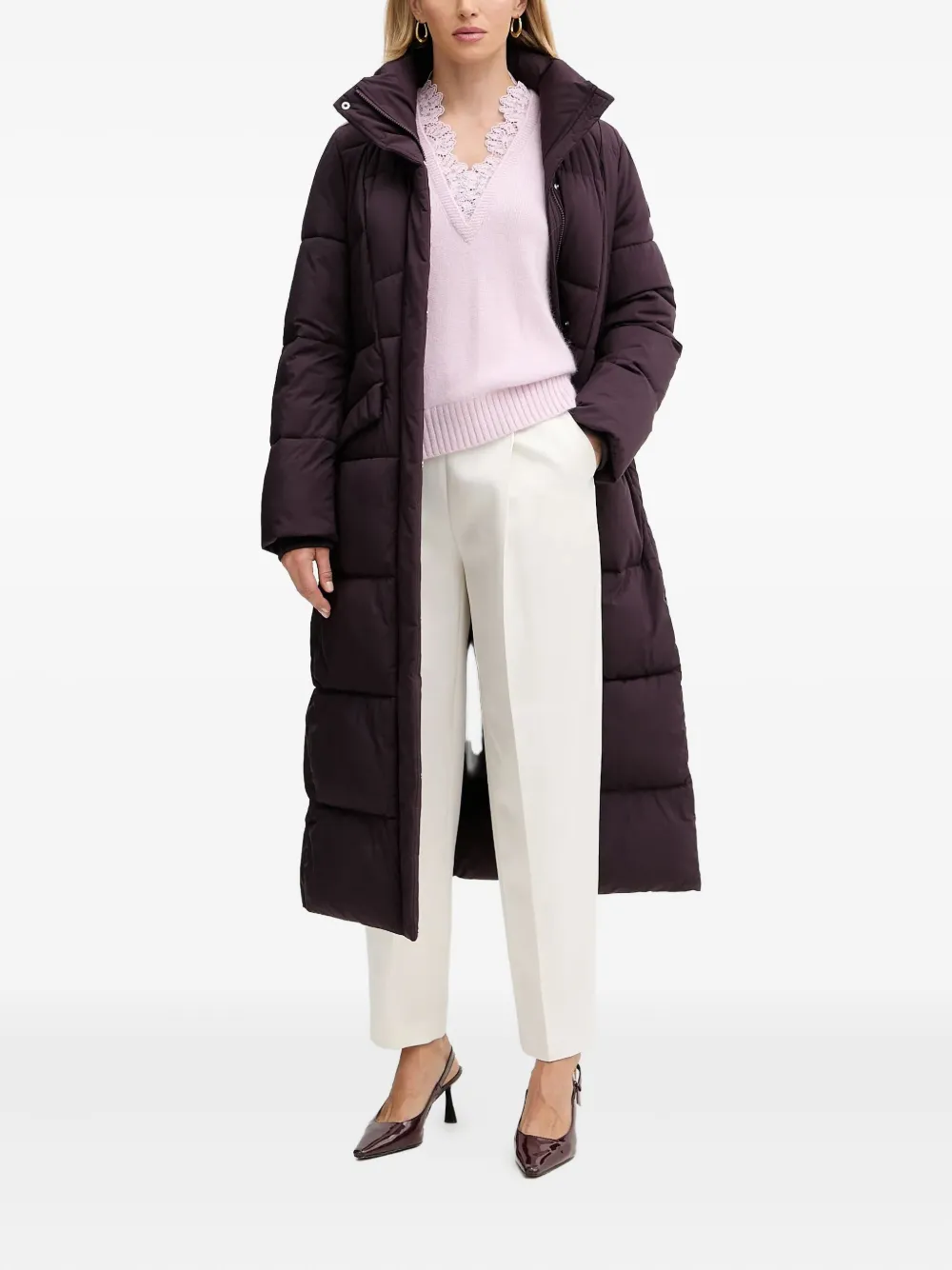темно-фиолетовый стеганый дизайн, высокий воротник, съемный капюшон, пояс на талии, боковые карманы с клапанами