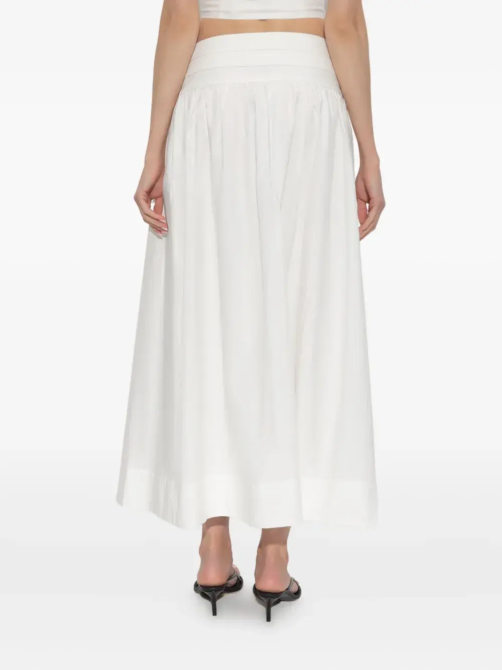 белая А-образная юбка с ярусным поясом и присборенными деталями