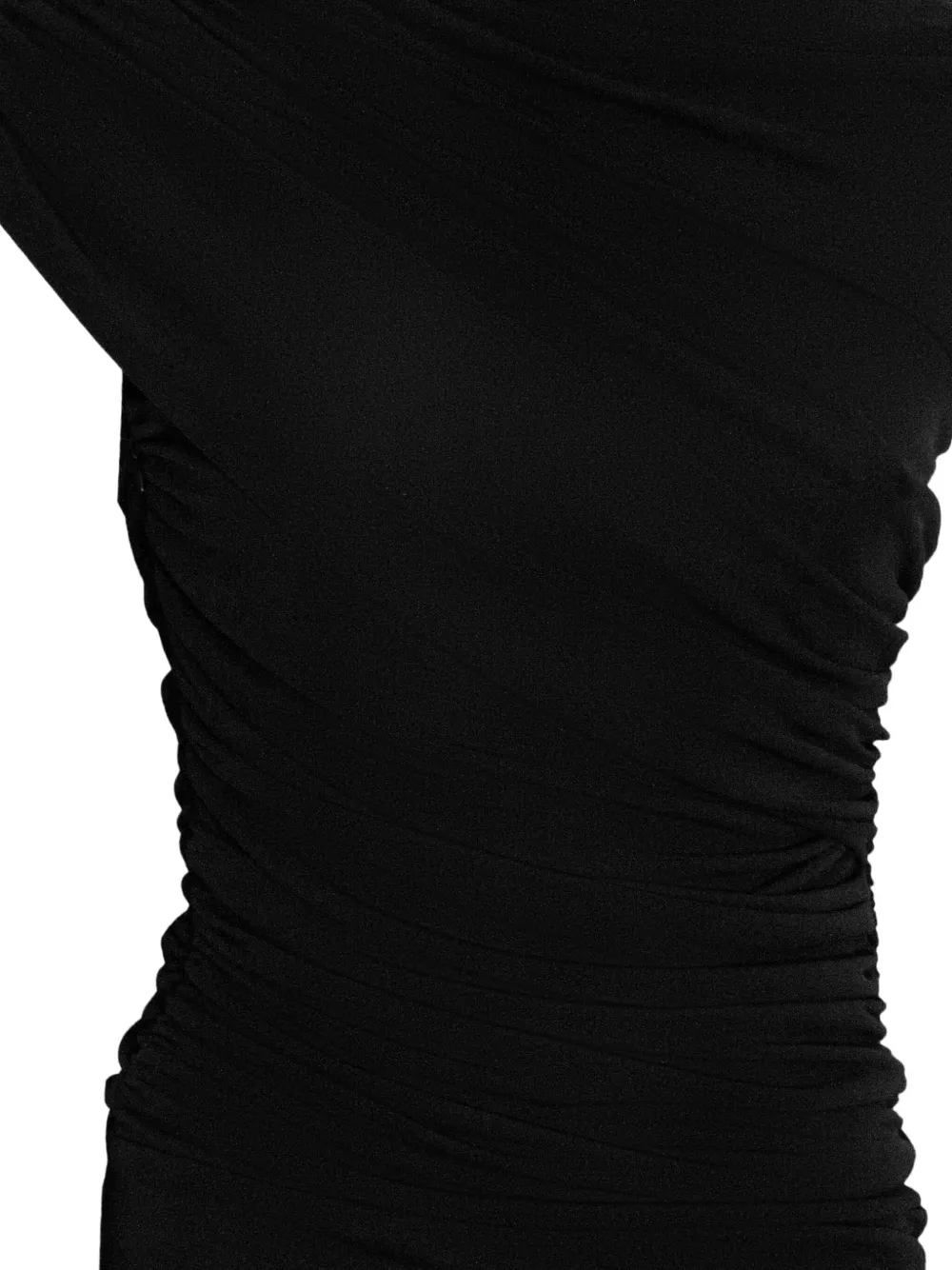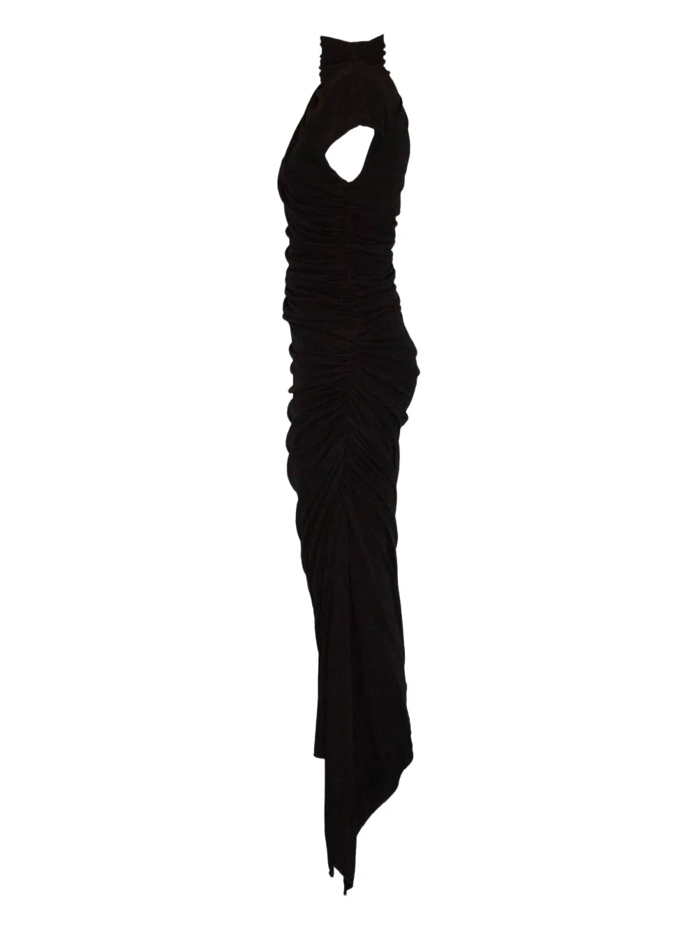 черный цвет, высокий воротник, короткие рукава, скрытая молния, драпированный дизайн, асимметричный подол, средняя длина