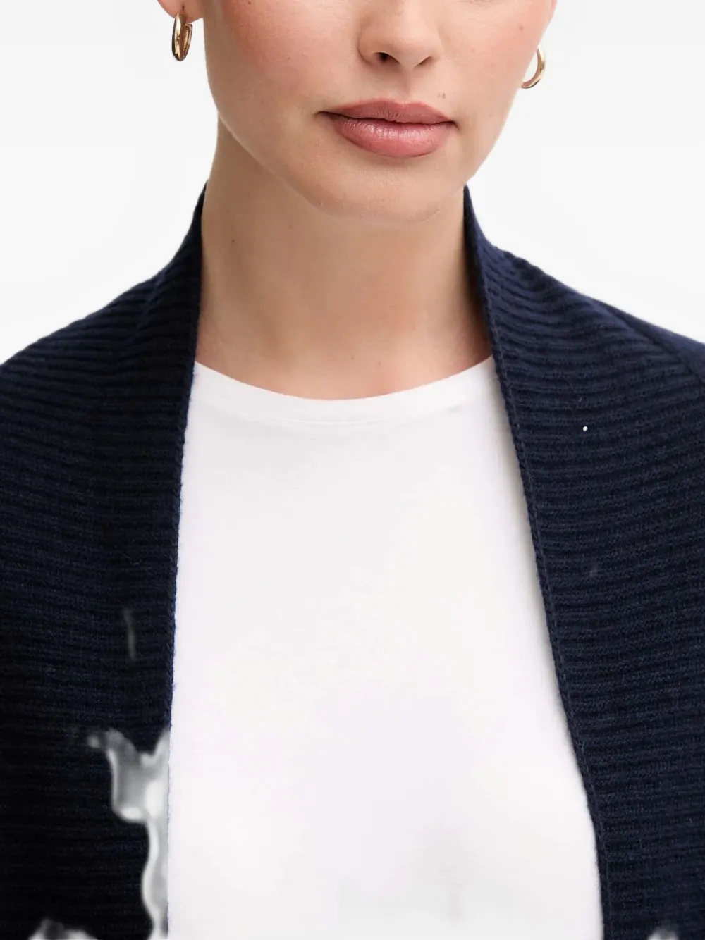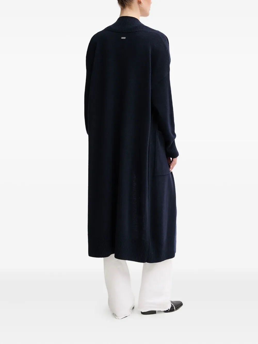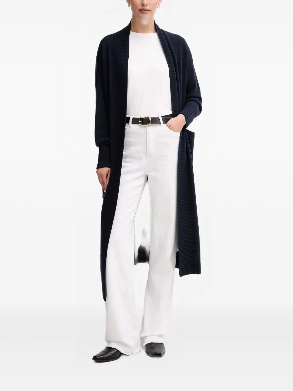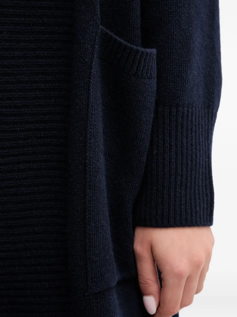 темно-синий в рубчик, вязаный, с открытой передней частью, длинными рукавами, накладными карманами спереди, средней длины