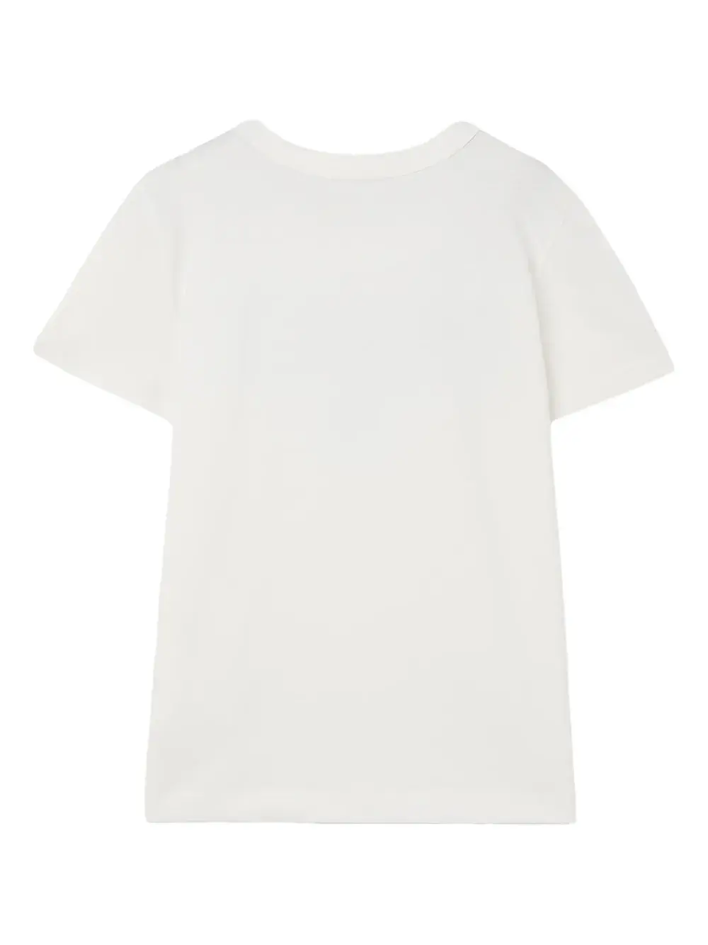 белая футболка с круглым вырезом, принтом логотипа и короткими рукавами