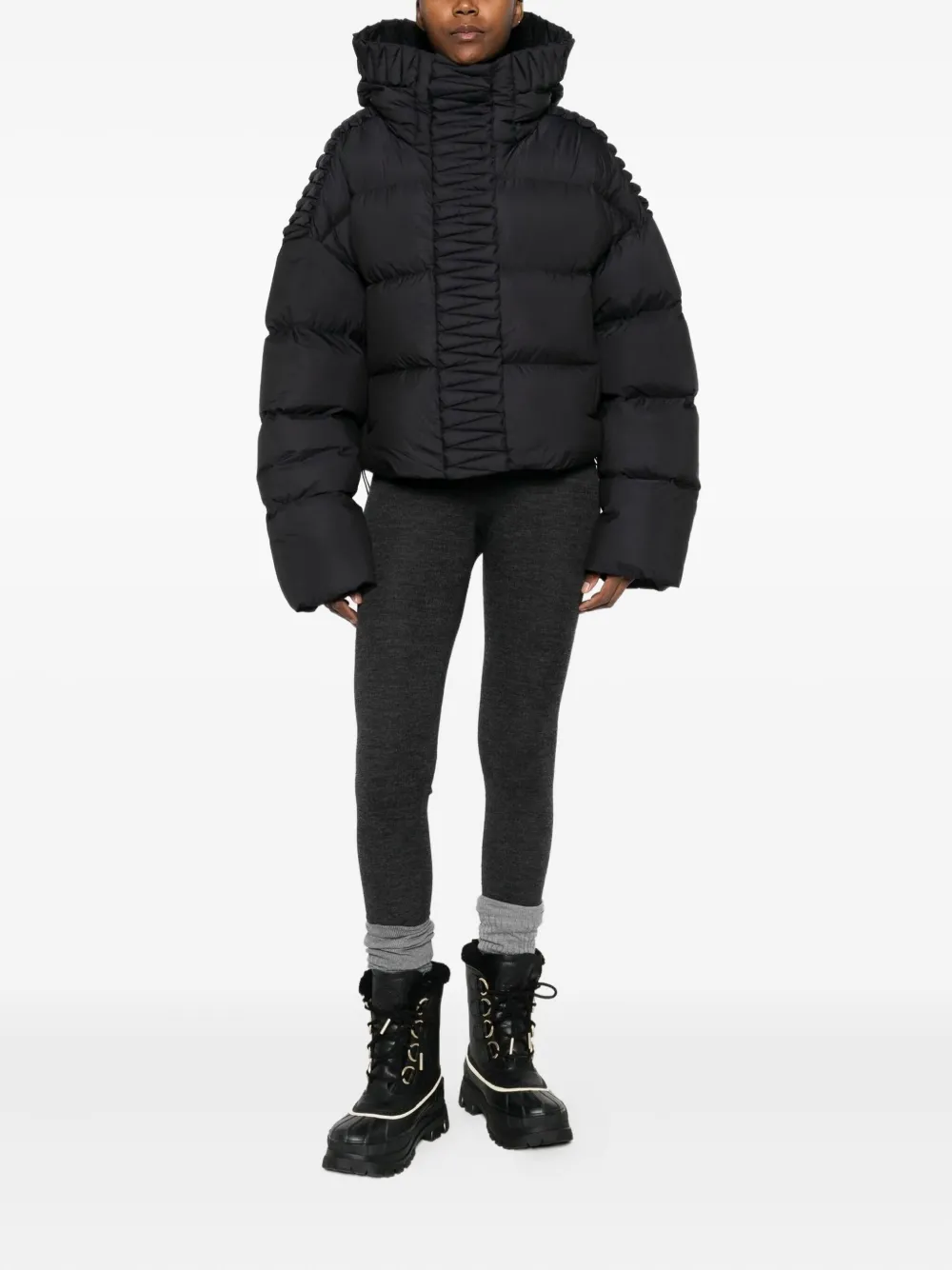 черный пухлый дизайн, стеганная отделка, зигзагообразные детали, скрытая застежка на пуговицы, заниженные плечи, длинные рукава, классический капюшон