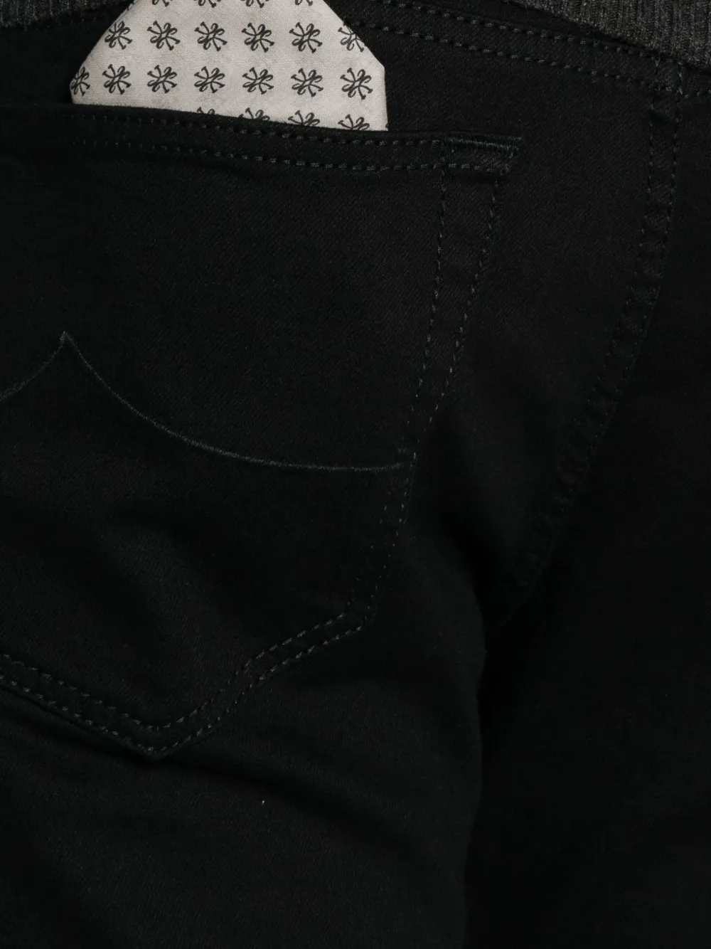 чёрная застёжка на пуговице, шлёвки для ремня, пять карманов, тональная строчка