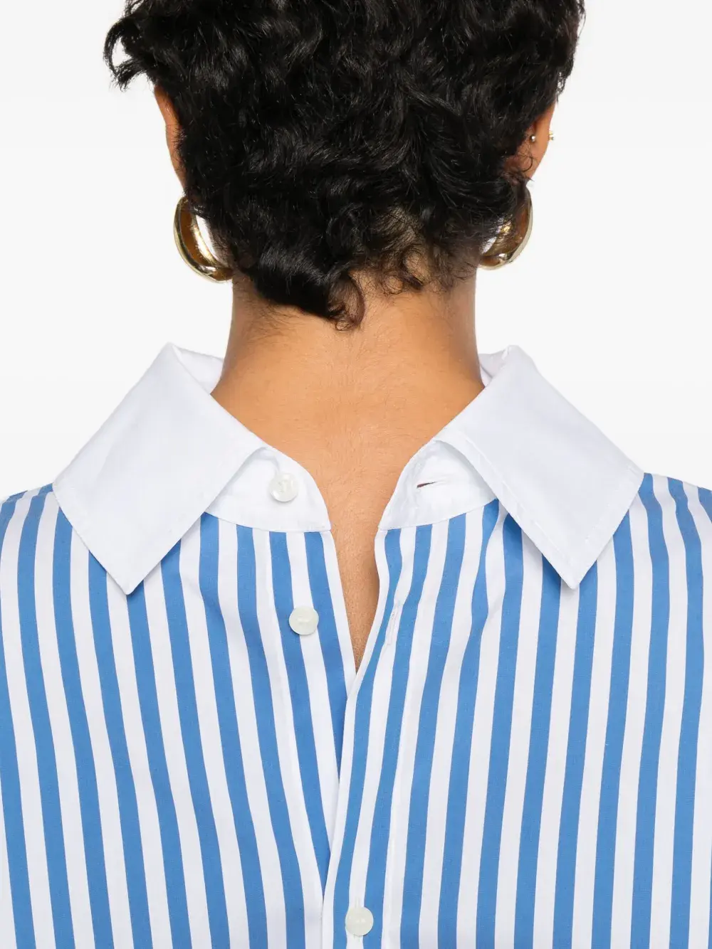 синий и белый полосатый узор, застёжка на пуговицы, воротник, длинные рукава, манжеты на пуговицах