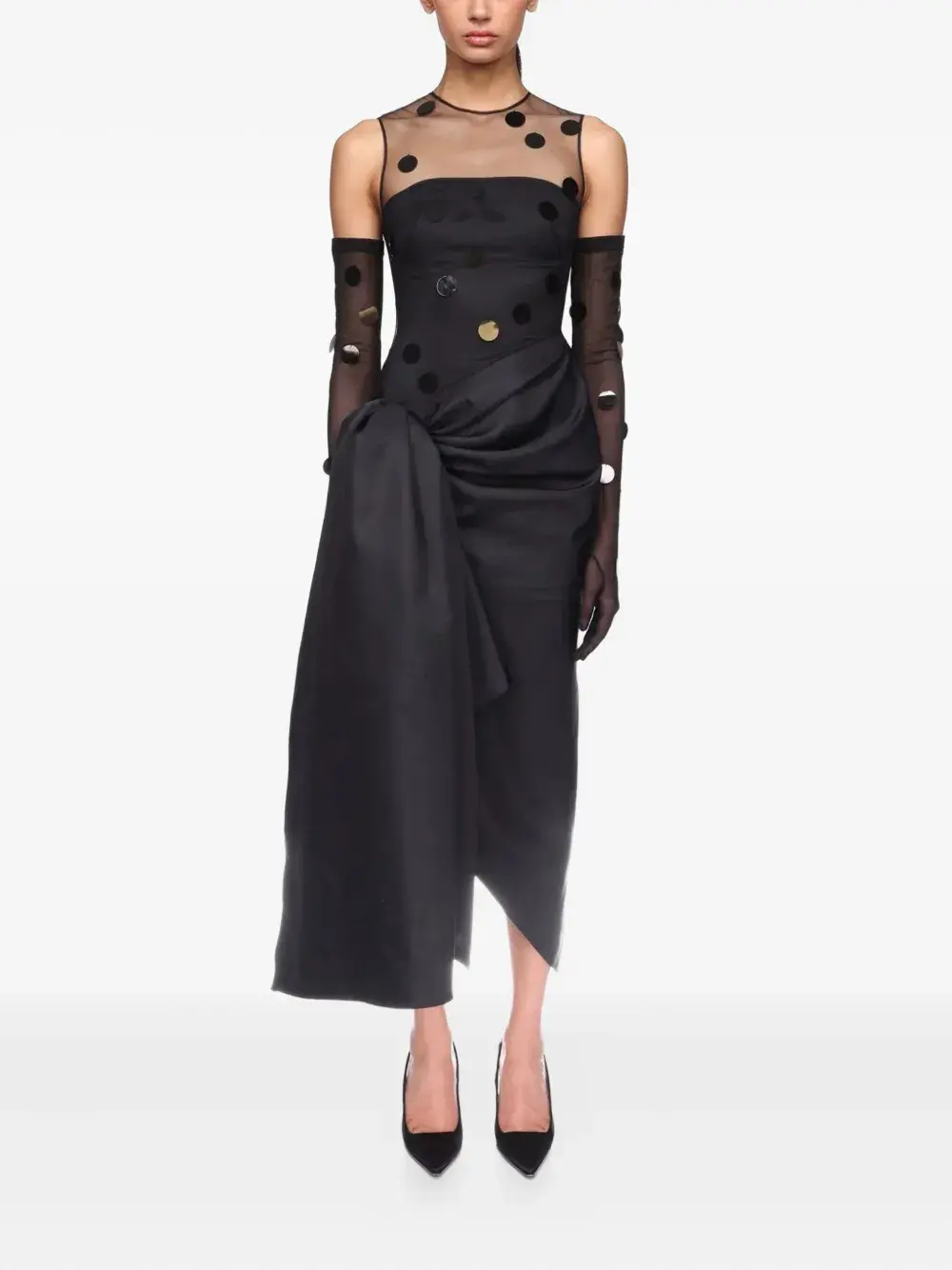 чёрные прозрачные вставки, узор в горох, круглый вырез, драпированная юбка, потайная застёжка-молния сзади, асимметричный подол