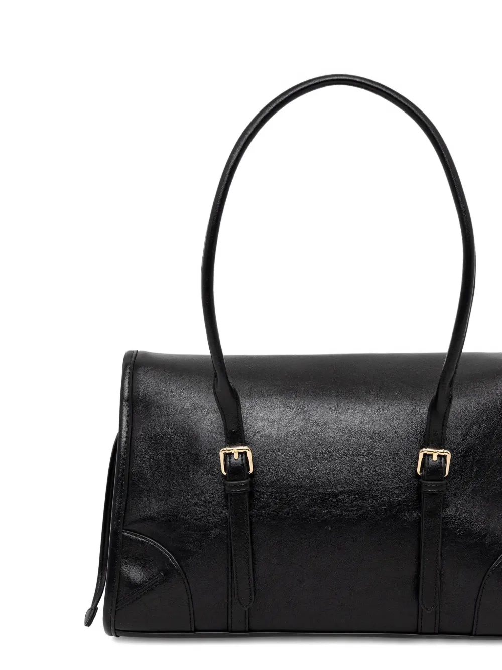 черная сумка с двумя верхними ручками, пряжками на ремешках, магнитной застежкой, фурнитурой золотистого оттенка и табличкой с логотипом
