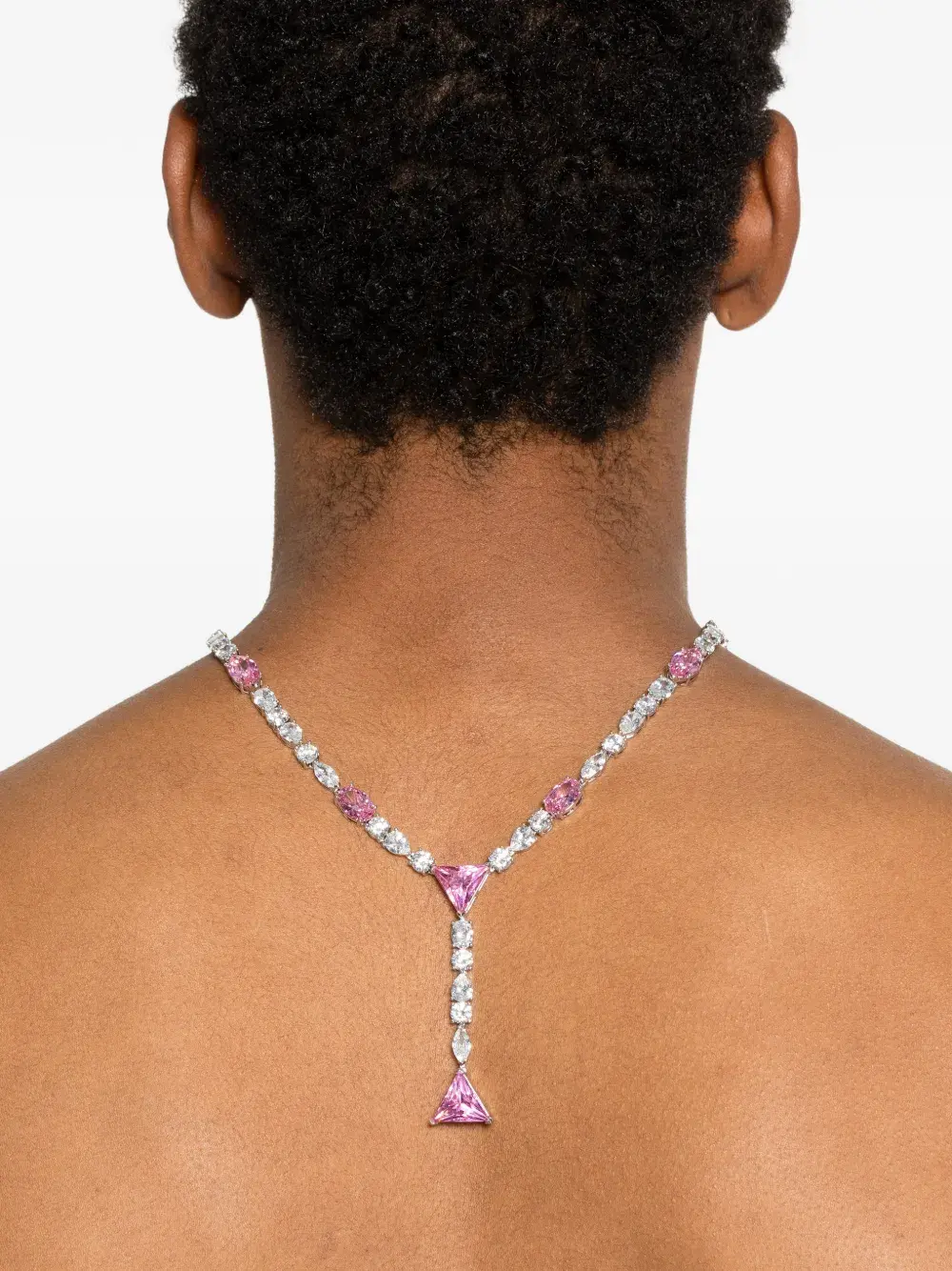 Серебристый оттенок, украшение из розовых кристаллов, овальные камни, подвеска в форме треугольника, застёжка-карабин, полированная отделка
