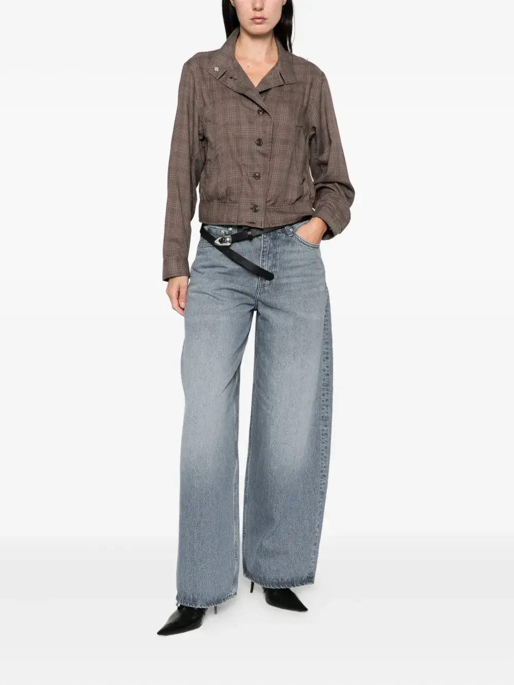 буро-синие джинсы с необработанным краем, пятью карманами и шлевками для ремня