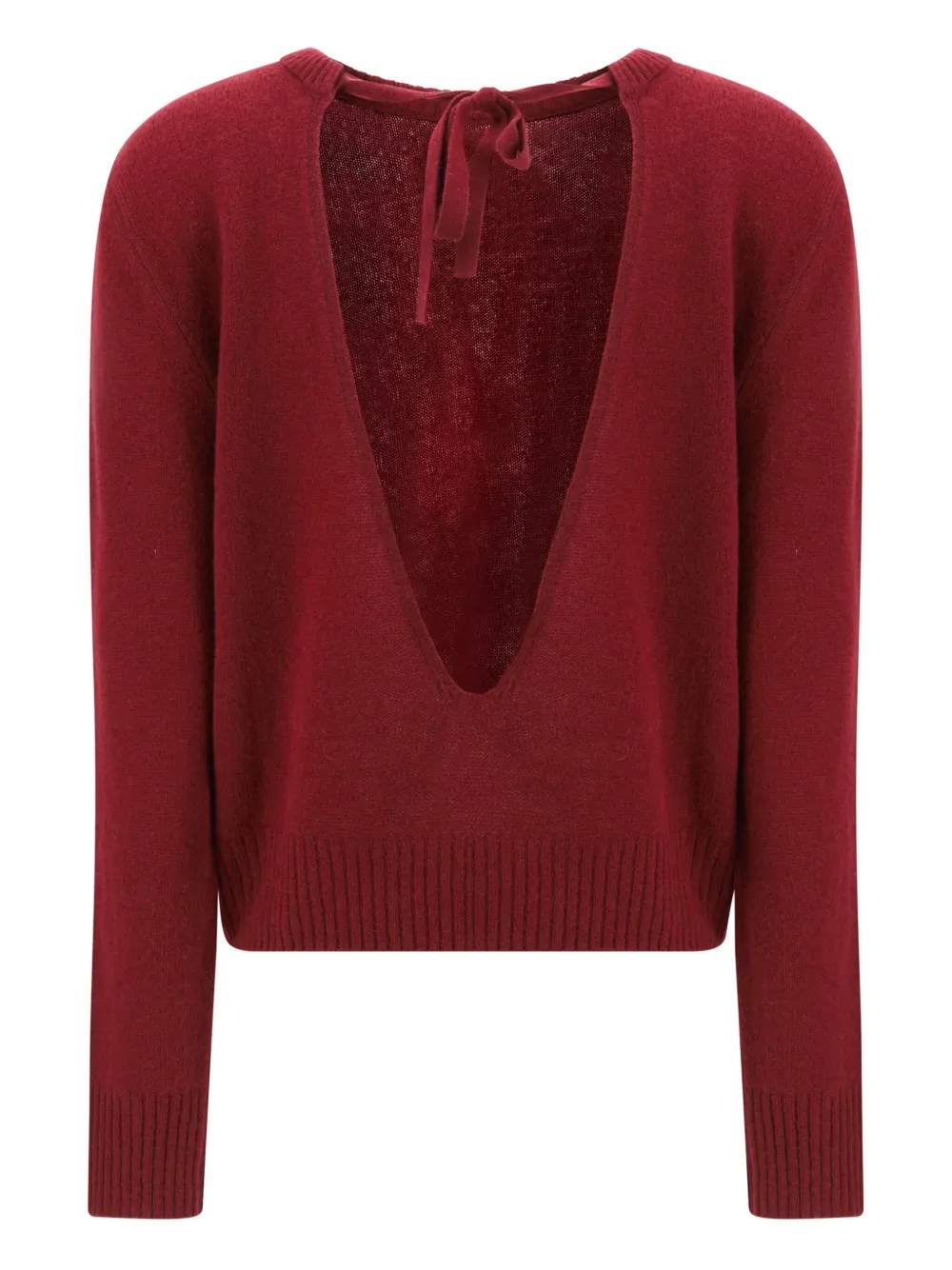 темно-красный кашемировый джемпер с круглым вырезом, длинными рукавами, открытой спиной и завязками