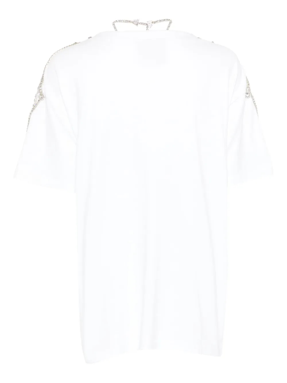 белый топ с украшением, цепочкой, короткими рукавами и круглым вырезом