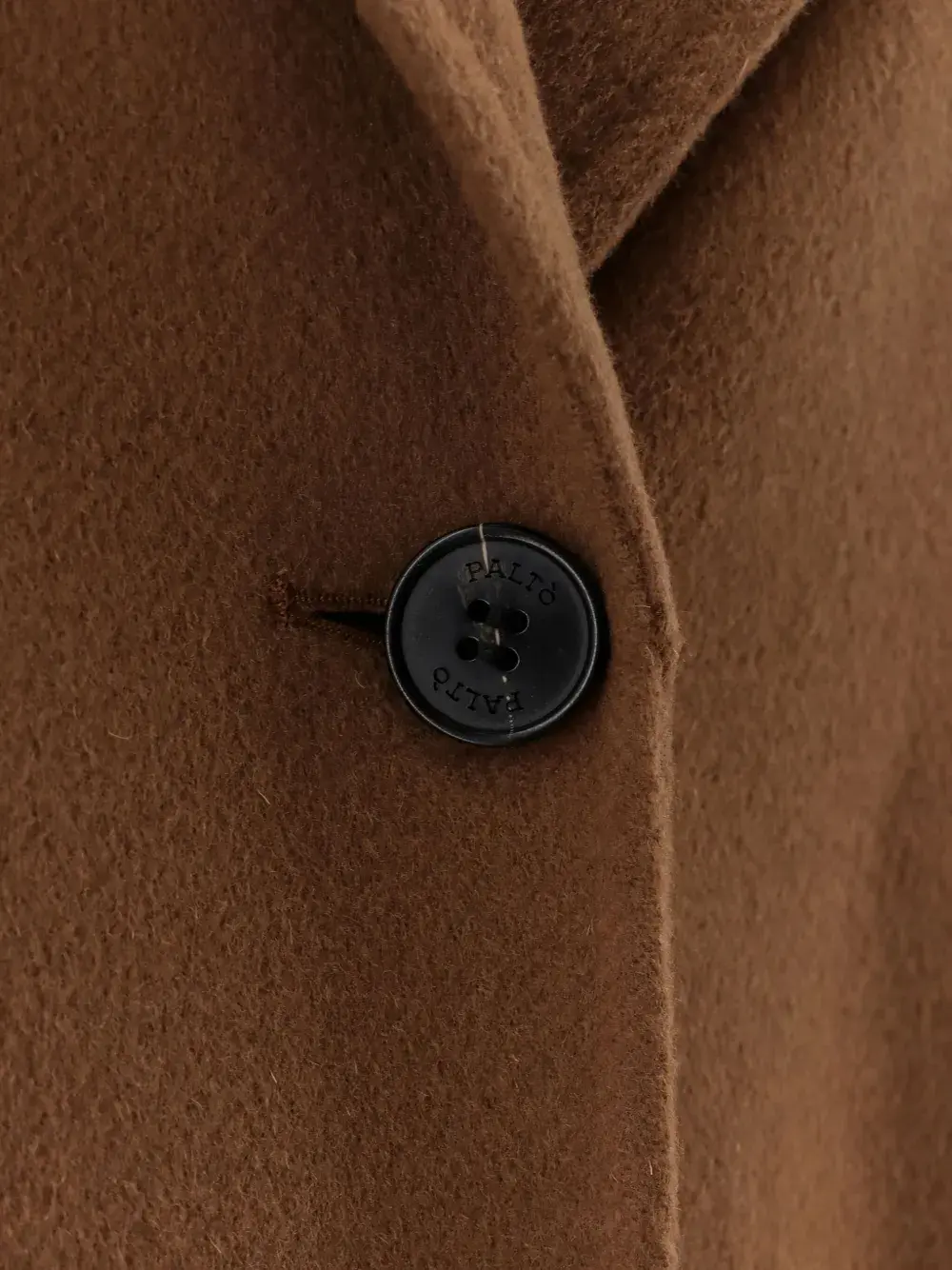 коричневый пиджак с застёжкой на три пуговицы, острыми лацканами и накладными карманами спереди