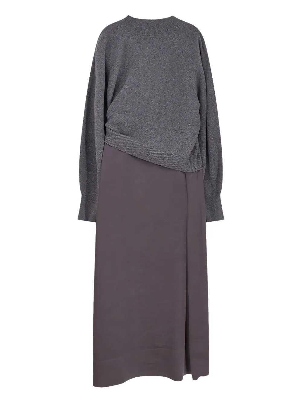 серое платье-комплект из трикотажа с фактурной вязкой: длинные рукава, круглый вырез, завязка, однотонный дизайн, свитер-комплект