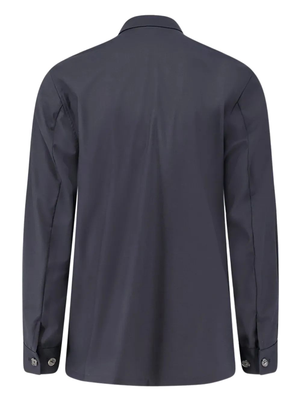 серый цвет, заострённый воротник, застёжка на пуговицы, длинные рукава, манжеты на две пуговицы, накладной карман спереди