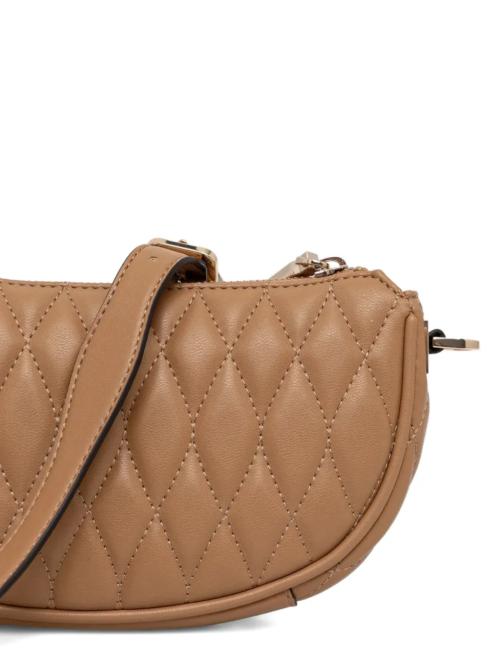 бежевый стеганый материал, деталь с логотипом, застёжка на молнии, регулируемый ремень, фурнитура золотистого оттенка