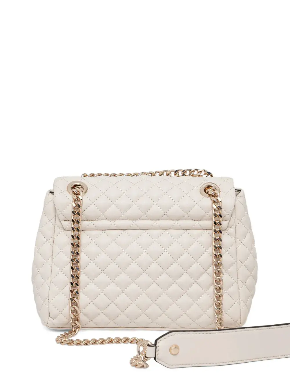 белая стеганая сумка с отделкой кристаллами, цепочкой, логотипом-табличкой и съёмным ремнём