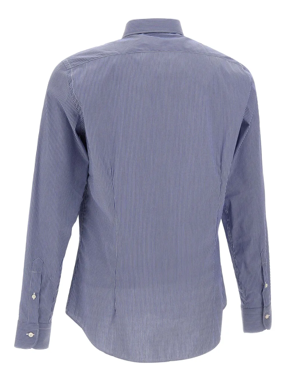 синий с полосатым узором, перламутровые пуговицы, длинные рукава, классический воротник, универсальные пуговицы на манжетах