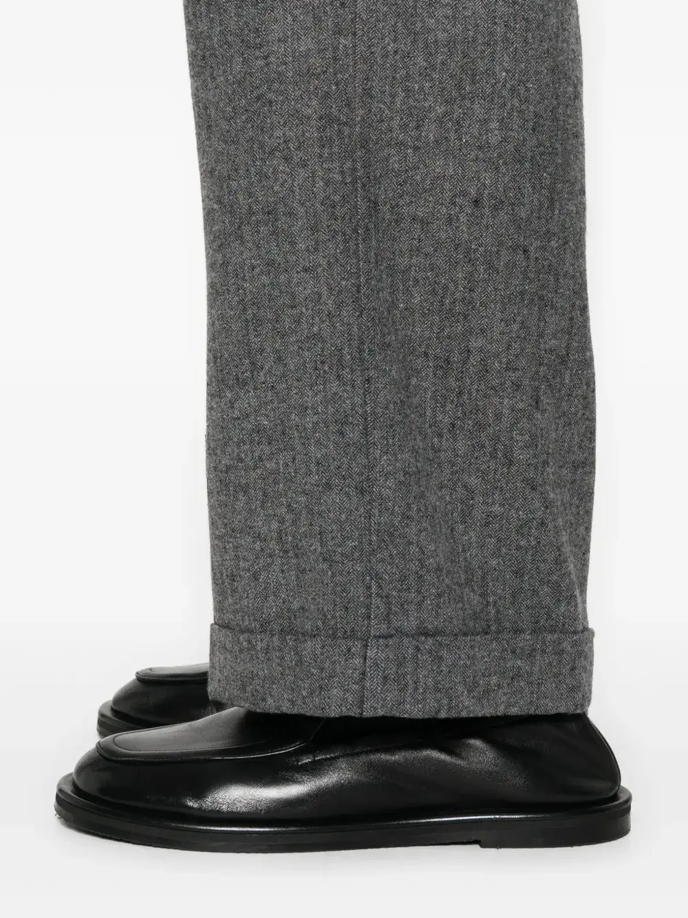 серо́е изделие с ёлочным узором, манжетами на штанинах, шлёвками для ремня и застёжкой на пуговицы спереди