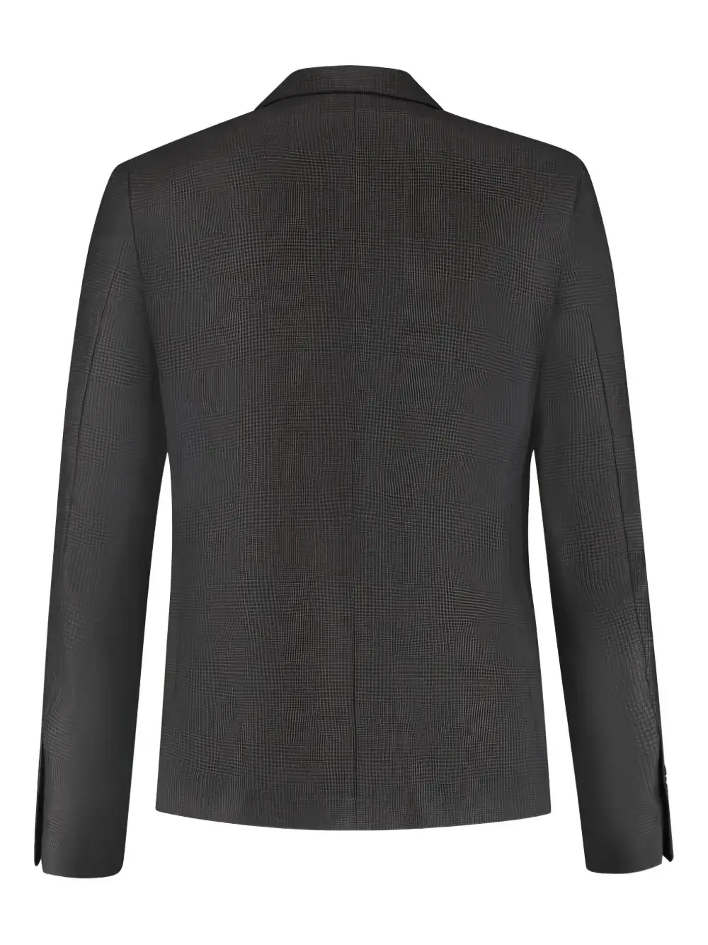 черно-клетчатый узор, застежка на пуговицы, лацканы с вырезом, боковые карманы