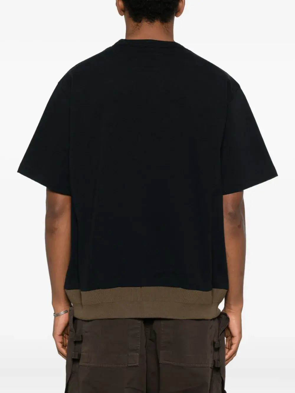 синий с аппликацией, круглый вырез, короткие рукава, панельный дизайн, ребристый низ