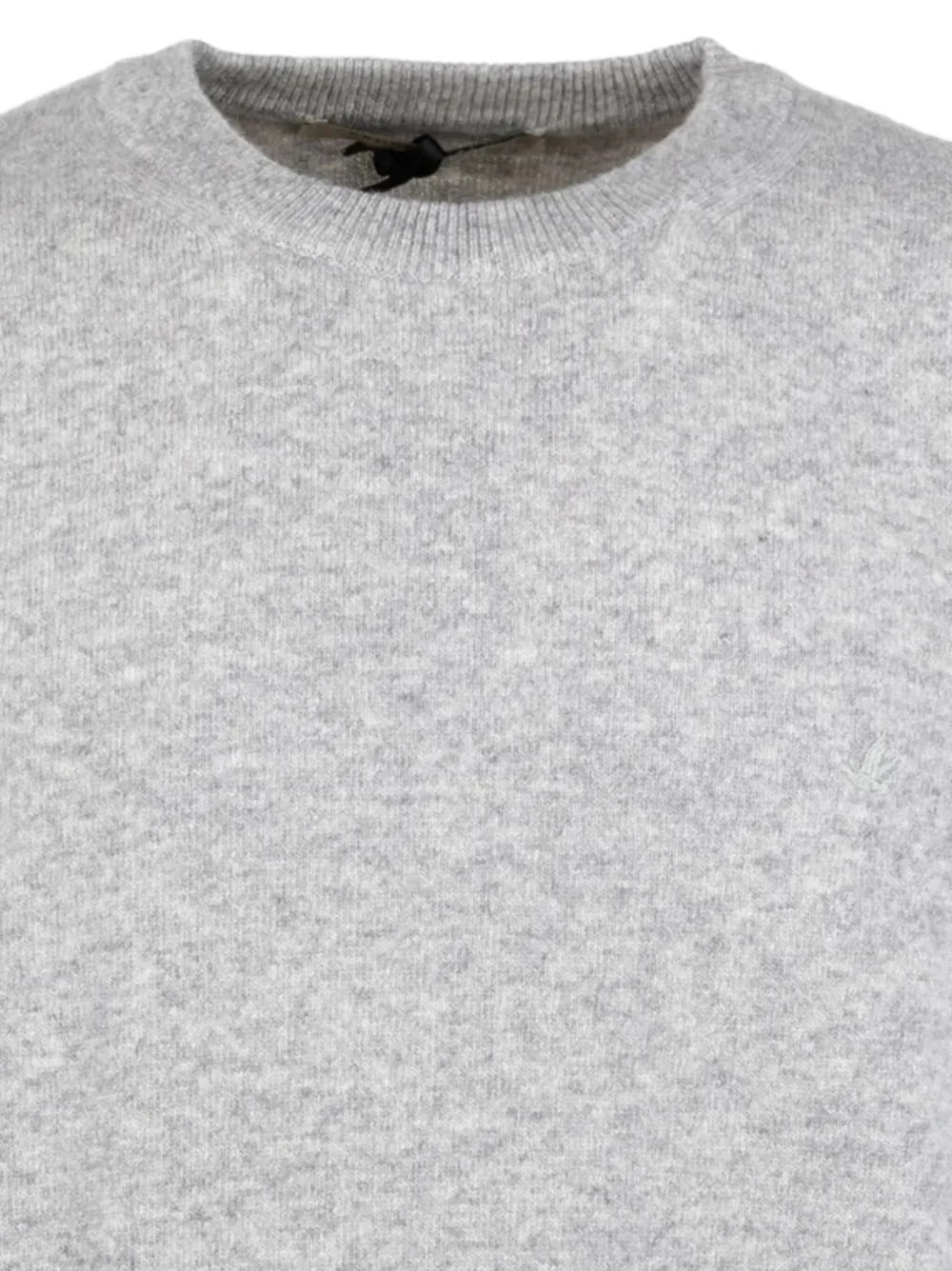 серый свитер с круглым вырезом, длинными рукавами, трикотажной резинкой по низу и манжетам