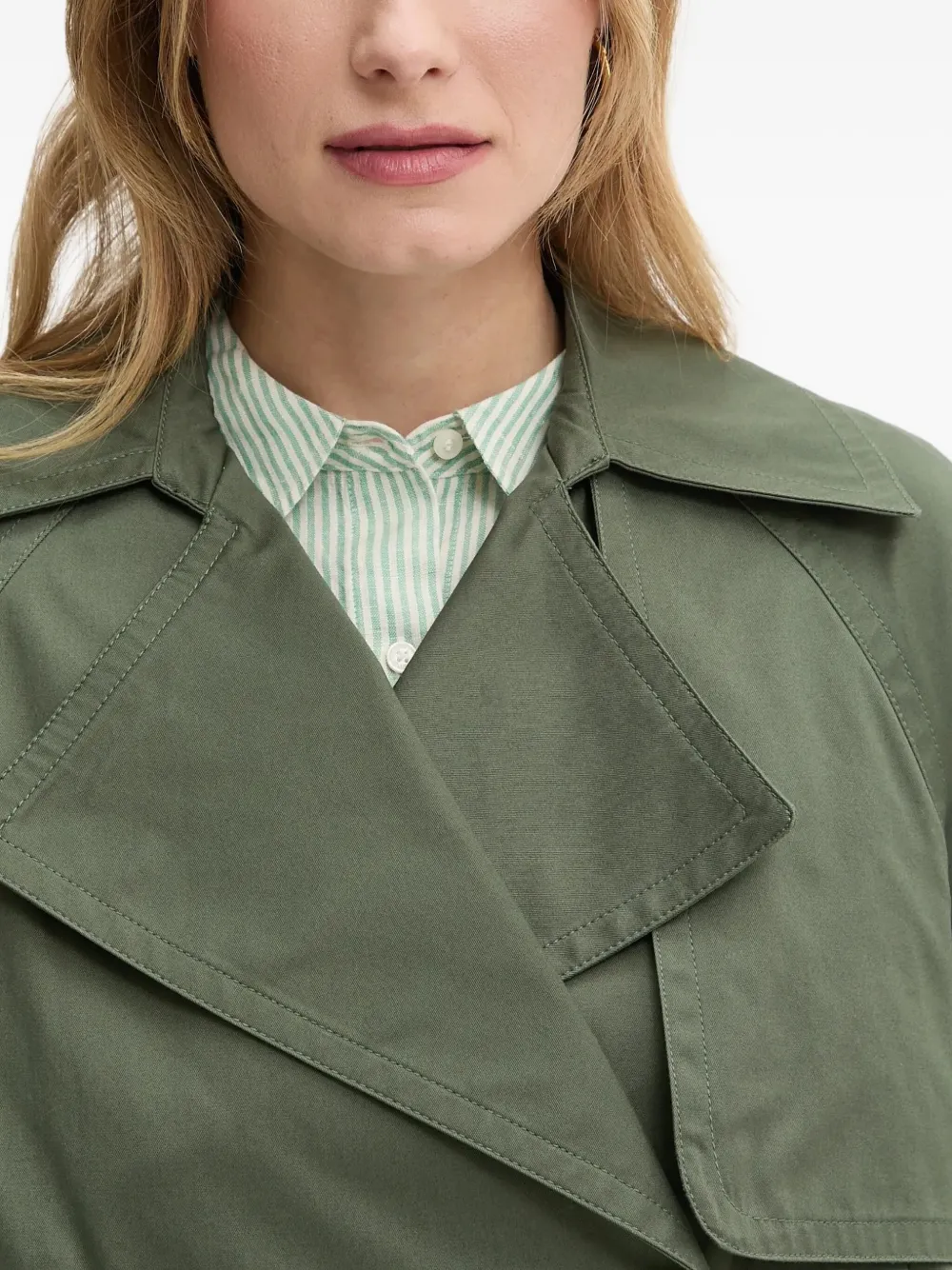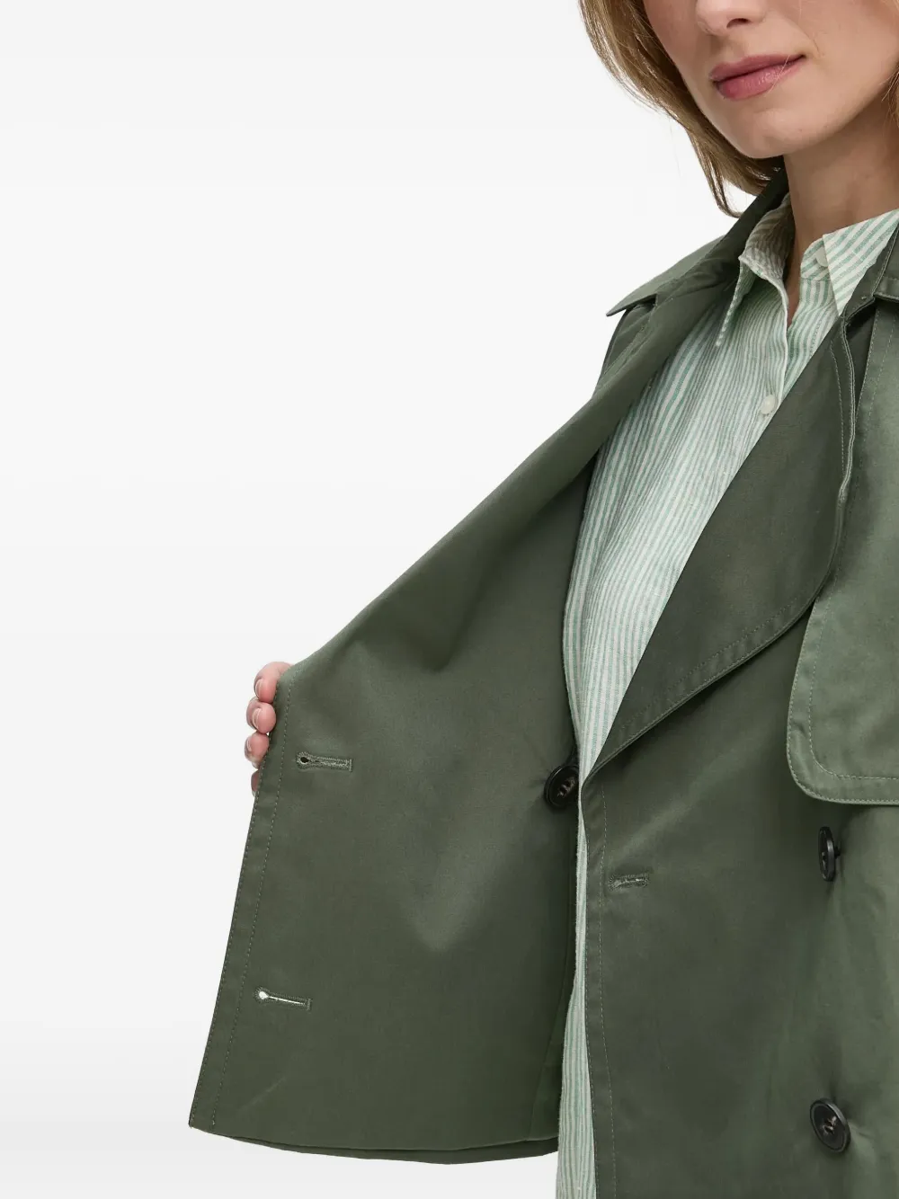 зеленый двубортный с застежкой на пуговицы, широкими лацканами, длинными рукавами и манжетами с поясом