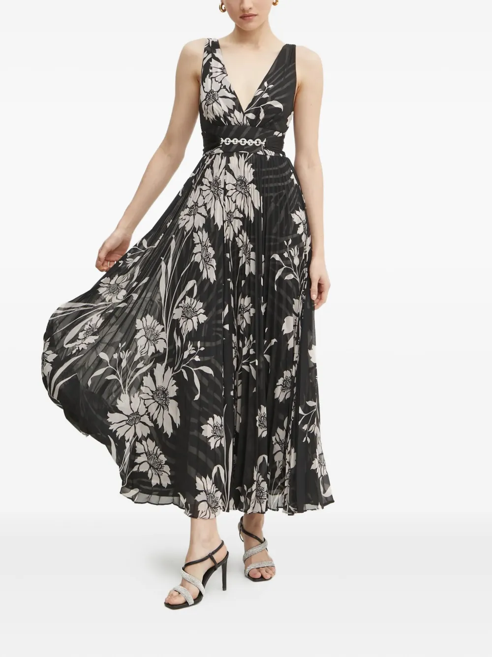 черное платье с цветочным принтом, плиссировкой, V-образным вырезом, без рукавов, с украшениями