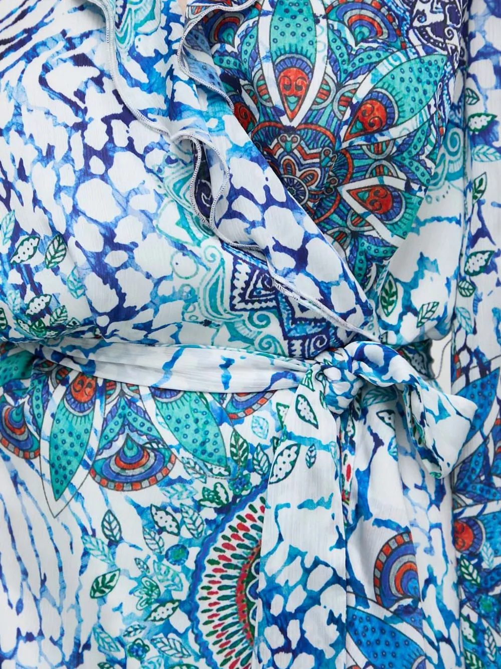 белый с принтом по всей поверхности, оборчатая отделка, V-образный вырез, длинные рукава, завязывается на пояс