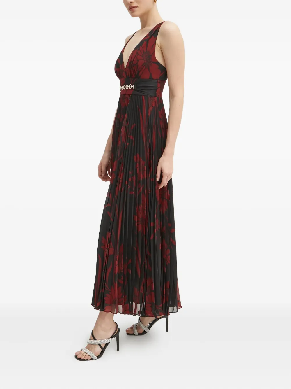 черное и красное платье с цветочным принтом, плиссировкой, V-образным вырезом, украшенным поясом, без рукавов, застежкой-молнией и крючком