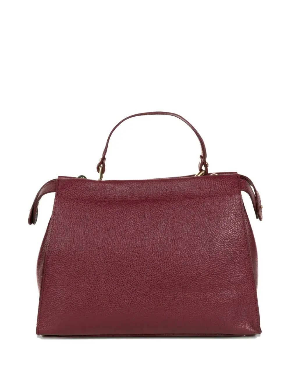 красная кожаная сумка с верхней ручкой, фурнитура цвета золота, прямоугольная табличка
