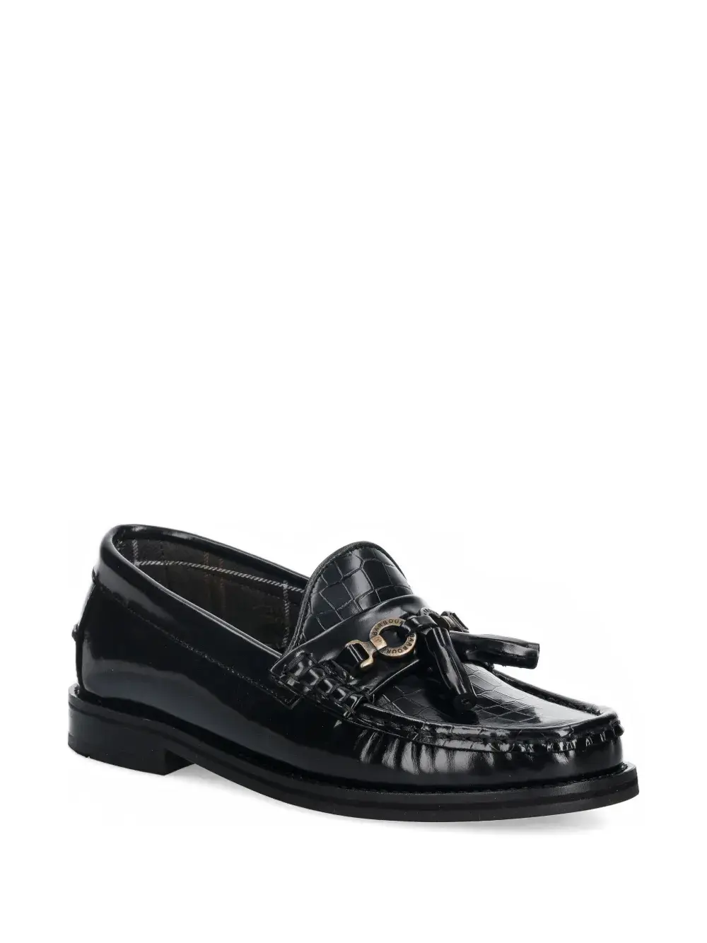 черная обувь с тиснением, кисточками, фурнитурой золотистого оттенка, без застежек, плоская подошва