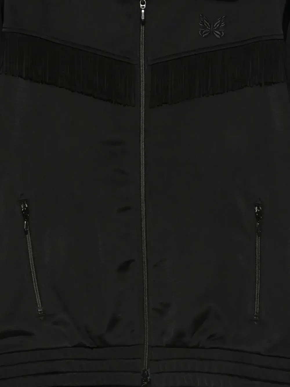 черная куртка с вышитым логотипом, отделкой бахромой, застежкой-молнией, карманами на молнии и ребристым подолом