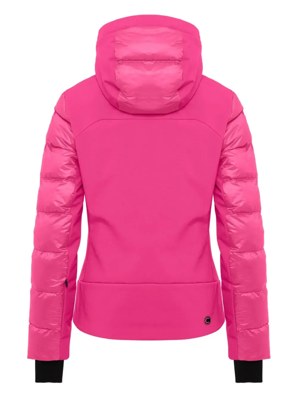 ярко-розовый пуховик с капюшоном, застёжка-молния, фирменный логотип, чёрные манжеты