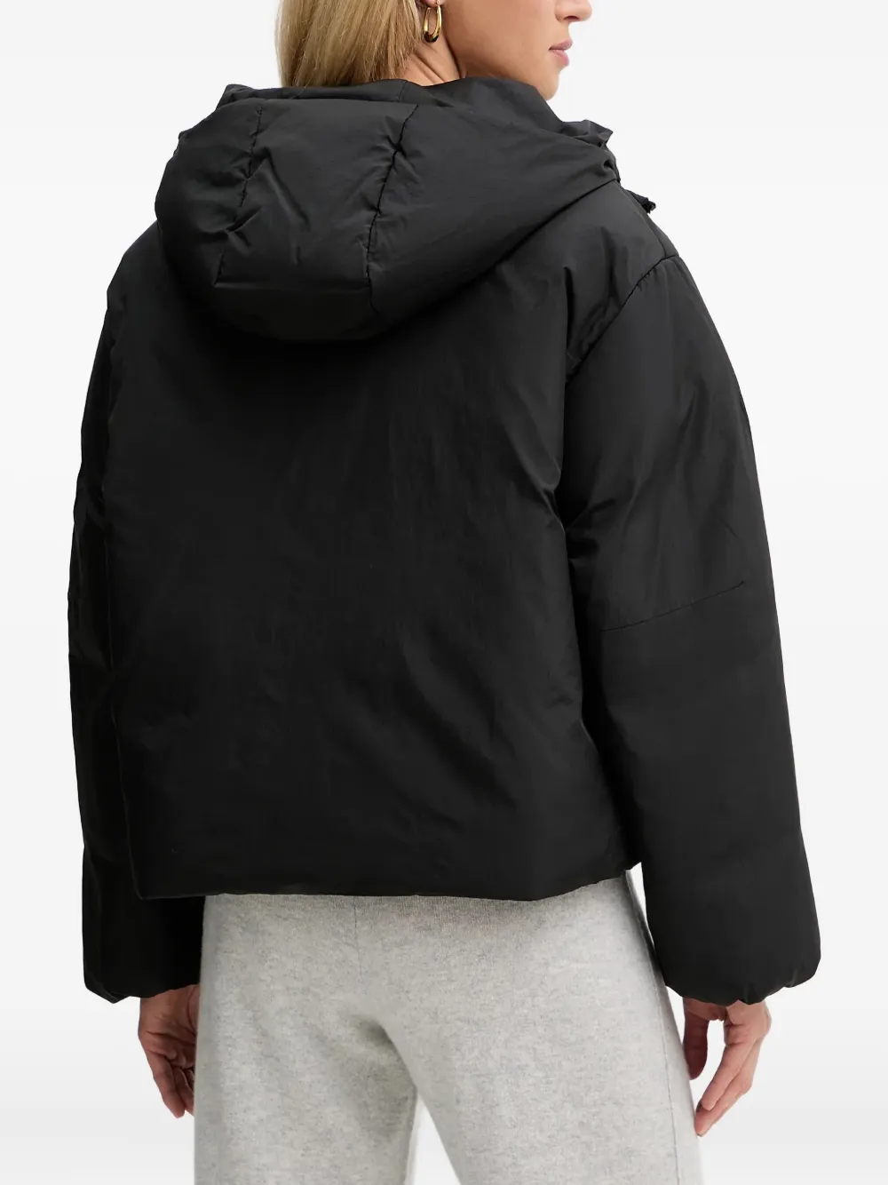 черная куртка с капюшоном, застежкой на молнию и кнопки, нашивкой с логотипом и прорезными карманами