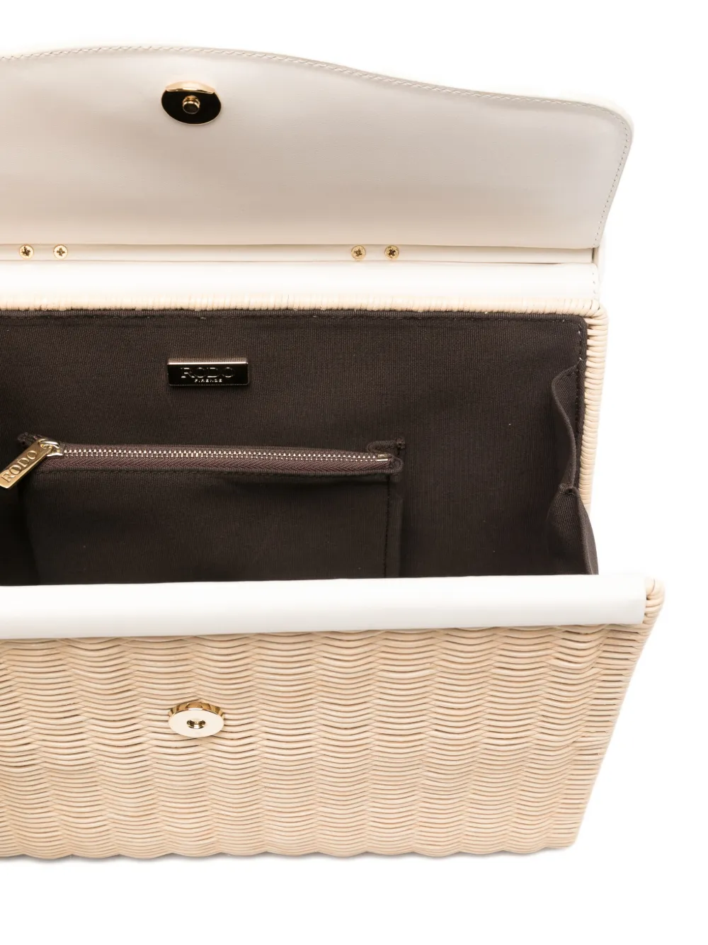 нейтральный цвет, верхняя ручка, съемный плечевой ремень, фурнитура золотистого оттенка, плетёный дизайн, внутренний карман на молнии, в комплекте прилагается защитный мешочек для хранения