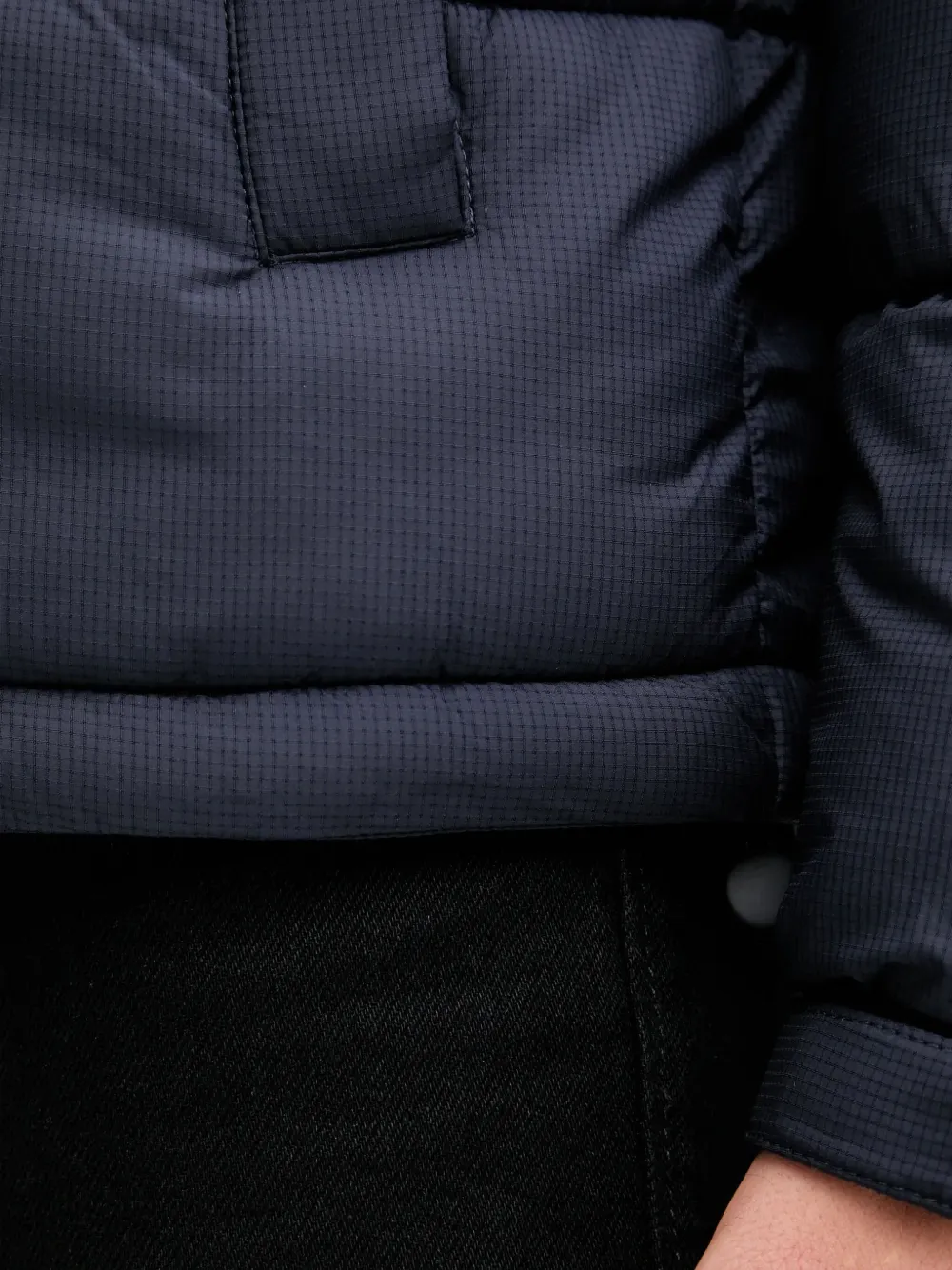 темно-синяя стеганая куртка с высоким воротником, застежкой-молнией и передним карманом