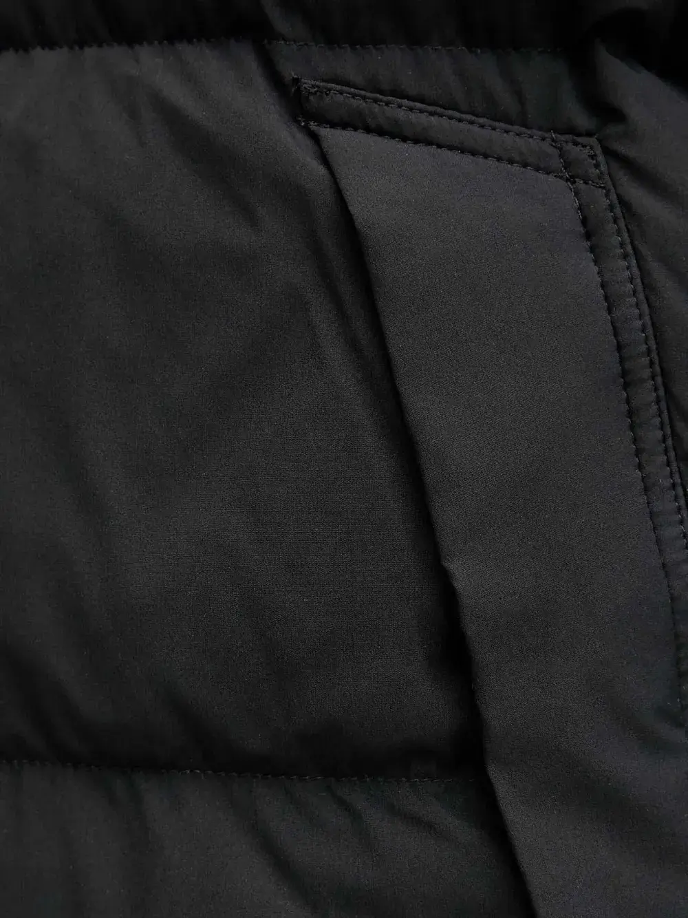 черная куртка с капюшоном, застежкой-молнией, боковыми карманами и стеганой отделкой