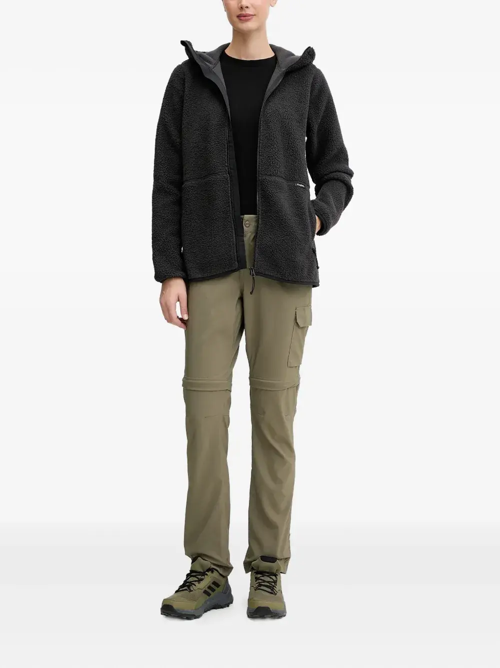 чёрная худи на молнии с капюшоном, нашивкой с логотипом и длинными рукавами