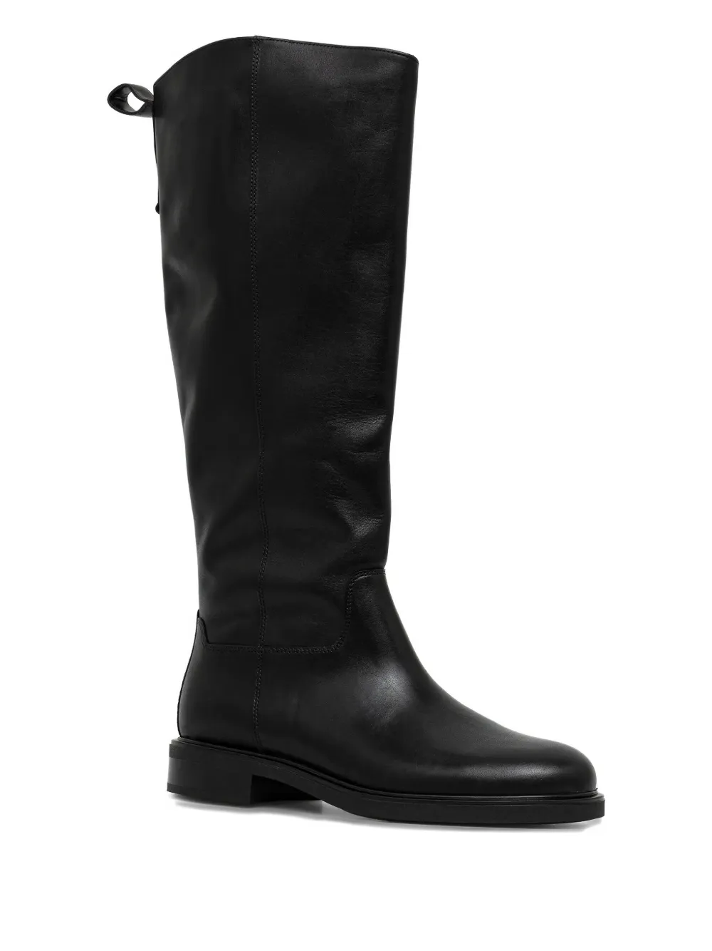 черные сапоги до колена с застежкой-молнией сбоку, язычком для натягивания у основания и круглым носком