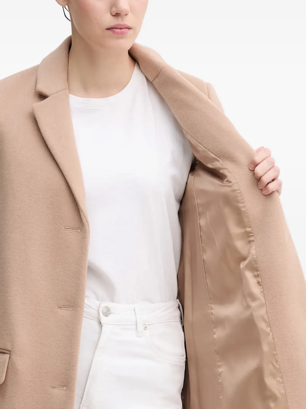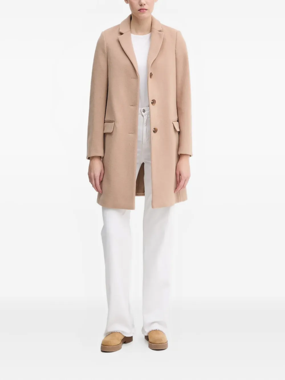 бежевый цвет, застежка на пуговицы, накладные карманы с клапанами, лацканы с вырезом, длинные рукава, прямой низ