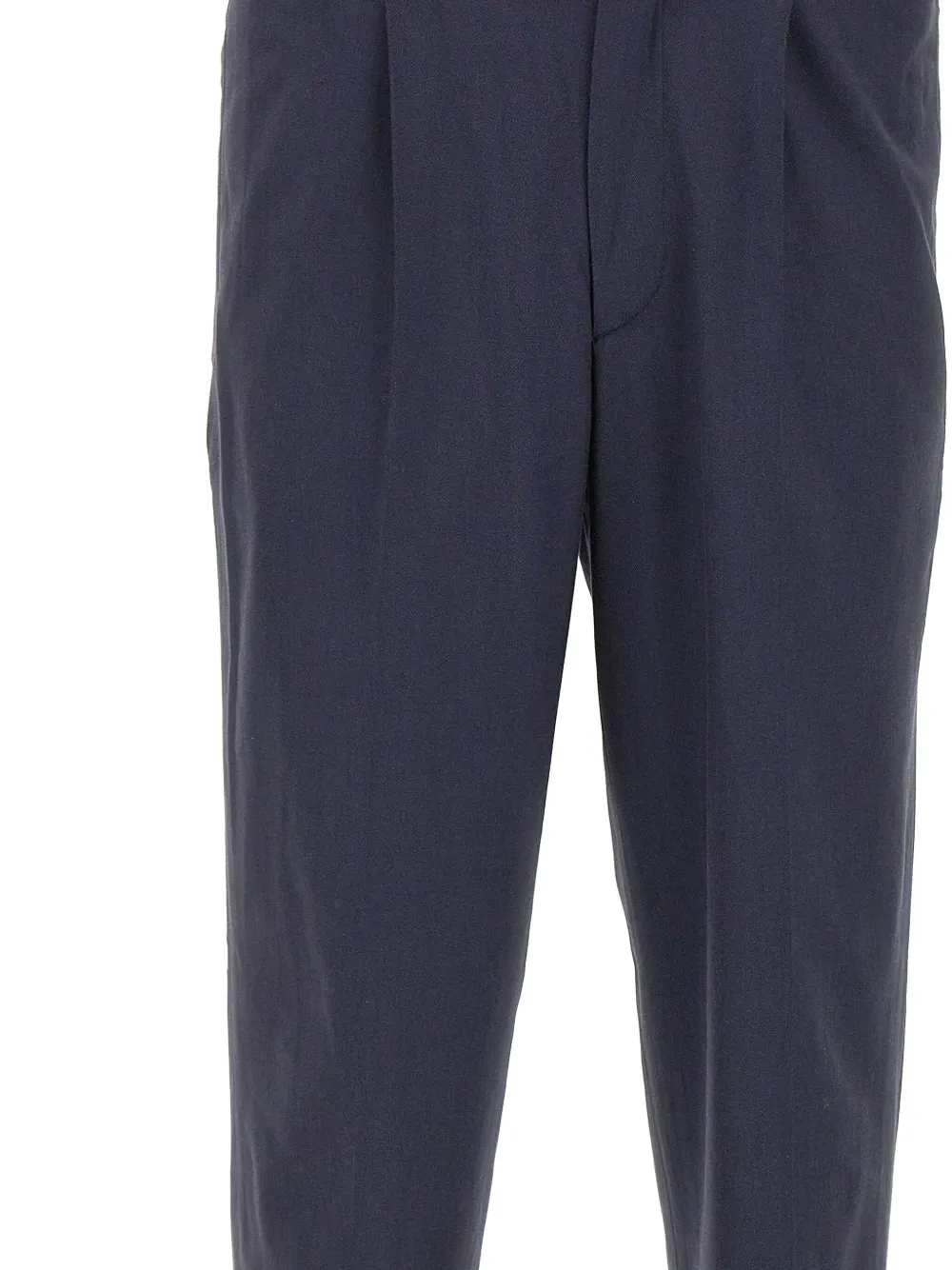 темно-синий цвет, эластичный пояс, складки спереди, боковые прорезные карманы, задние карманы, застежка-молния