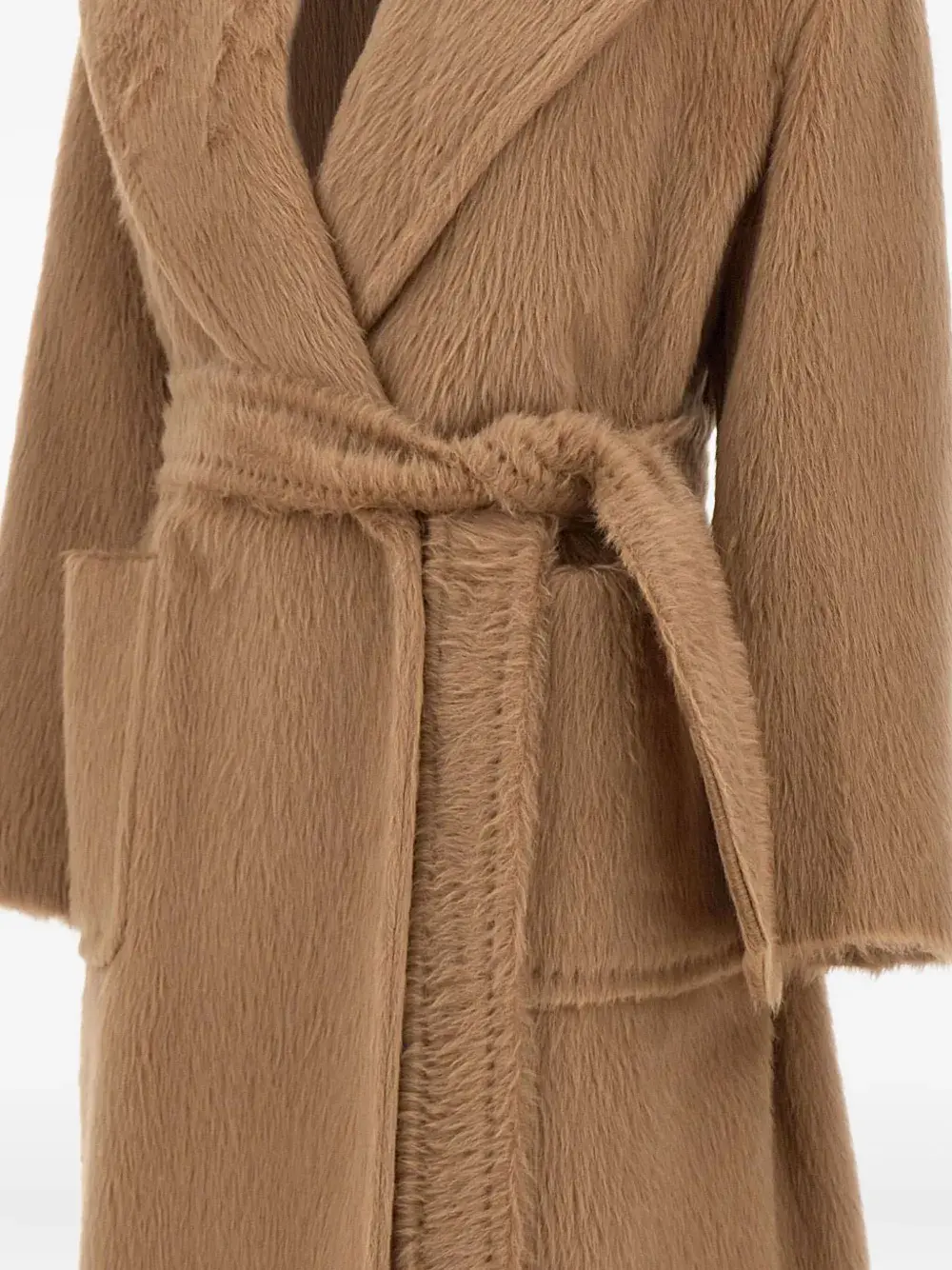 коричневый, широкие лацканы, пояс на завязке, передние карманы