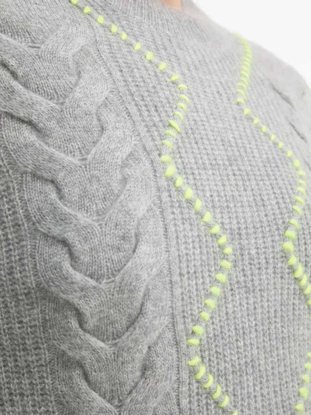 светло-серый джемпер с круглым вырезом, кабельной вязкой, простроченными деталями, длинными рукавами и ребристым краем