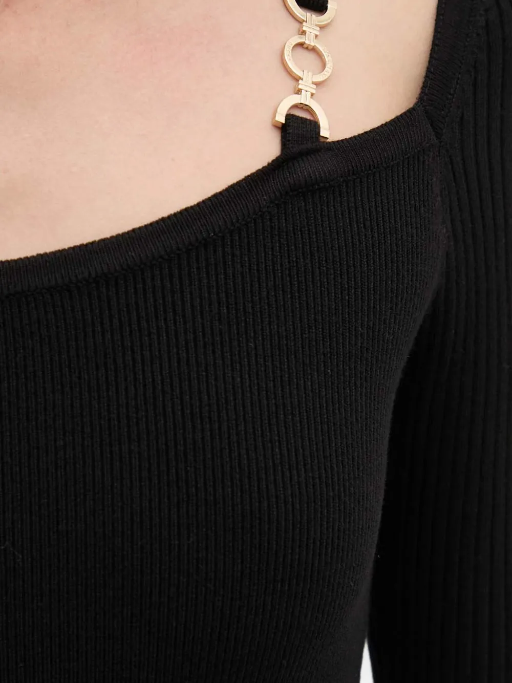 чёрный вязаный топ в рубчик с цепочкой, квадратным вырезом и рукавами три четверти